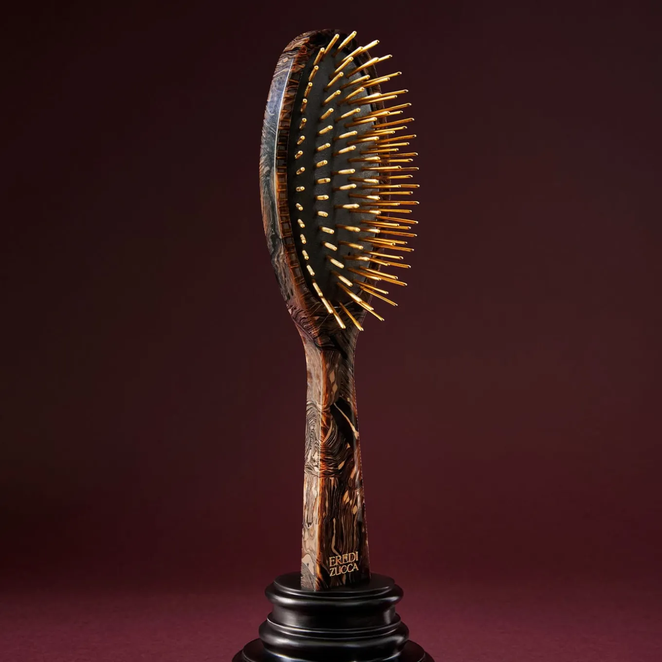 This elegant hairbrush’s Chocolate Carrara acetate handle has been crafted by the hands of our expert Italian artisans. A gold finish on the metal bristles brings out its refined allure, designed to gently massage the skin in order to stimulate circulation and strengthen the roots. Elevated with a luxurious gold Eredi Zucca logo. Naturally characterised by irregular patterns and color, it may present subtle differences from the item shown in the image that are not to be considered flaws.