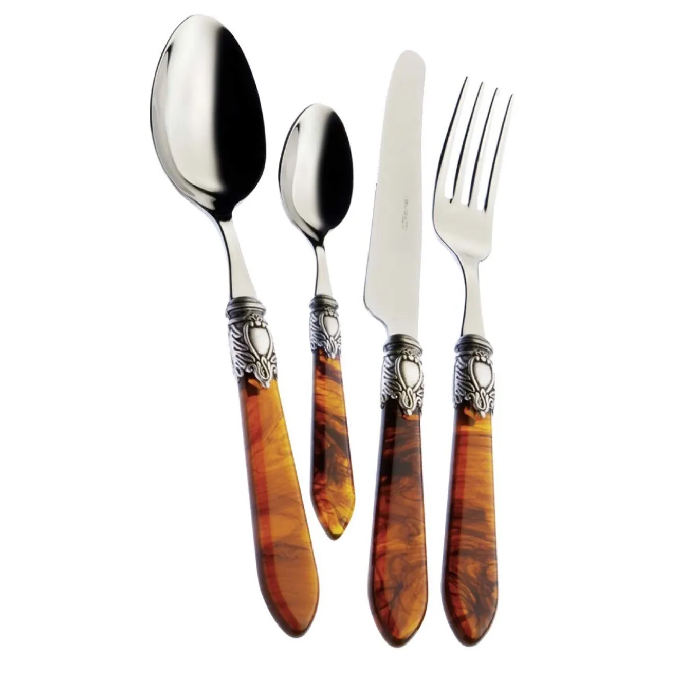 Crafted of 18/10 stainless steel, this set is accented with a vintage-inspired design on the handle in a precious silver-plating finish that will enrich any table with sophistication and style. The sleek, elongated handle is made of acrylic and features a stunning amber color that mimics perfectly the darkly clouded, honey hues of the fossilized resin. Composed of 6 table spoons, 6 table forks, 6 table knives and 6 coffee spoons, this set comes in an elegant wood box.