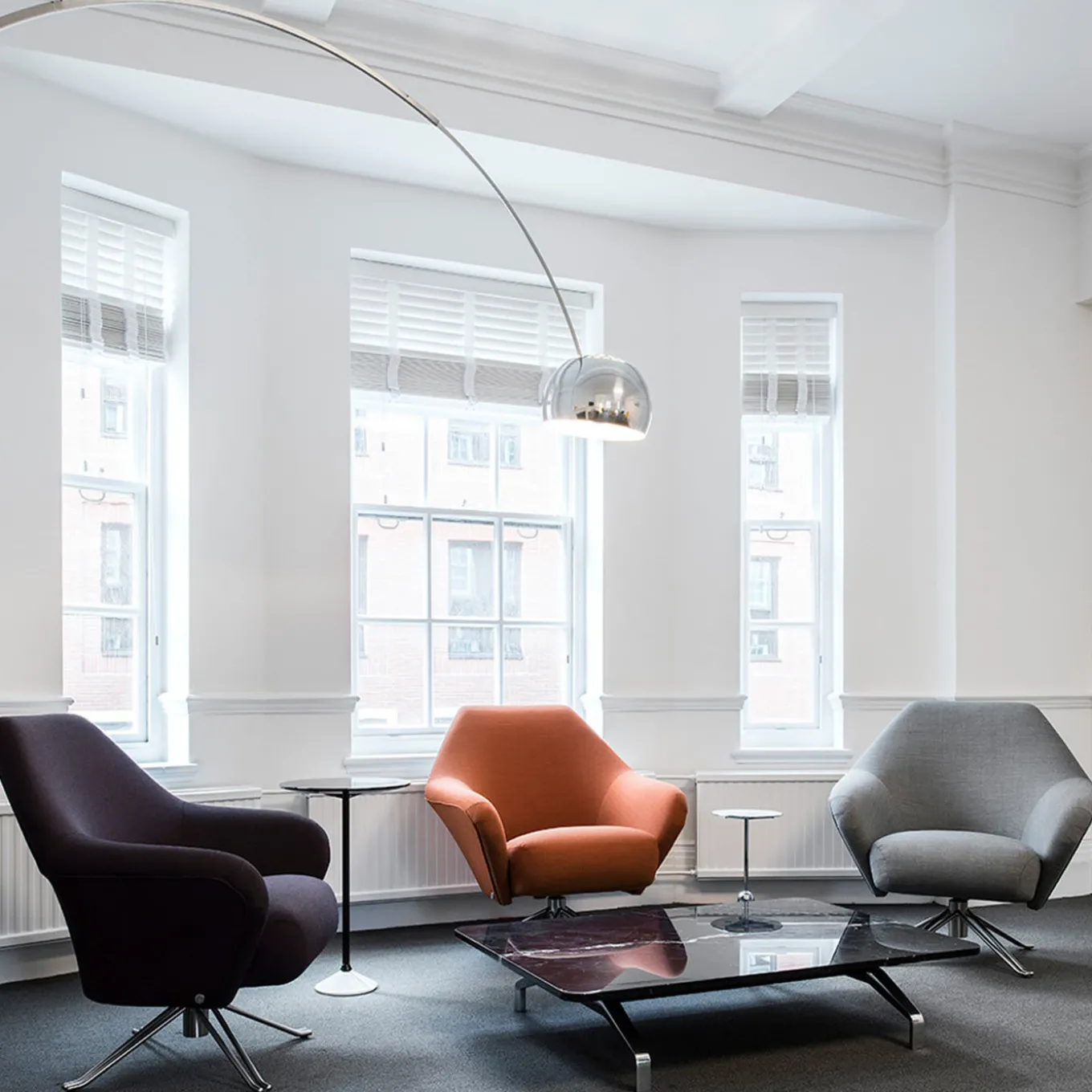 This swivel armchair designed in 1956 is a timeless piece of furniture capable of proving unrivaled comfort through a mechanism that allows it to automatically return to its original state. Its steel frame consists of a four-spoke base with a satin nickel finish that supports the sinuous and voluptuous seating area, where the thick seat cushion is set in a wraparound structure comprising the backrest and closed armrests. Upholstery in light gray Remix fabric.