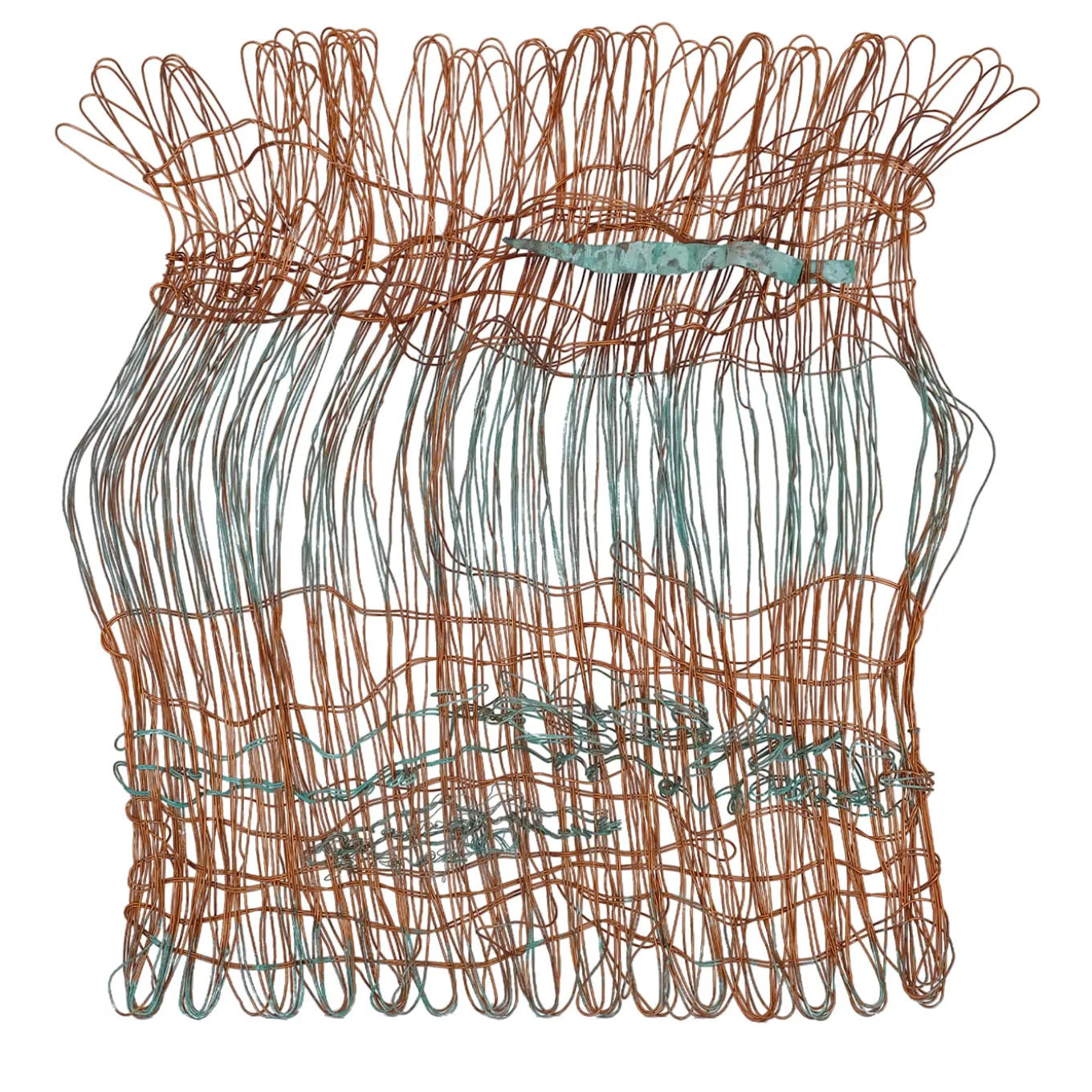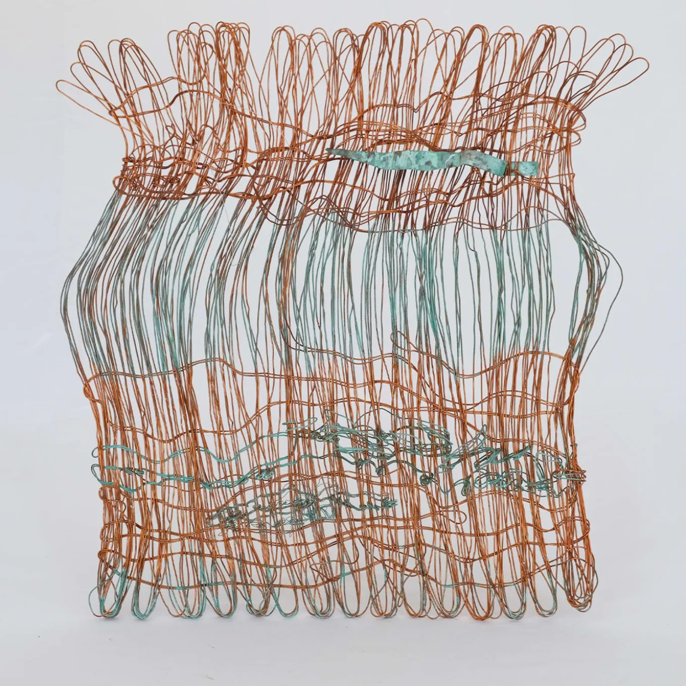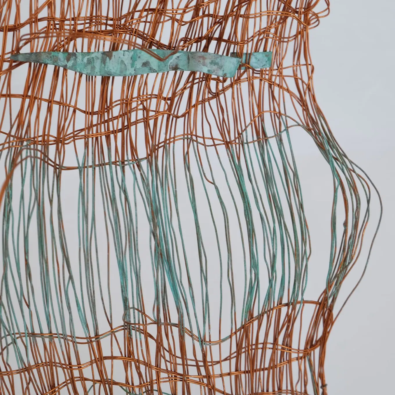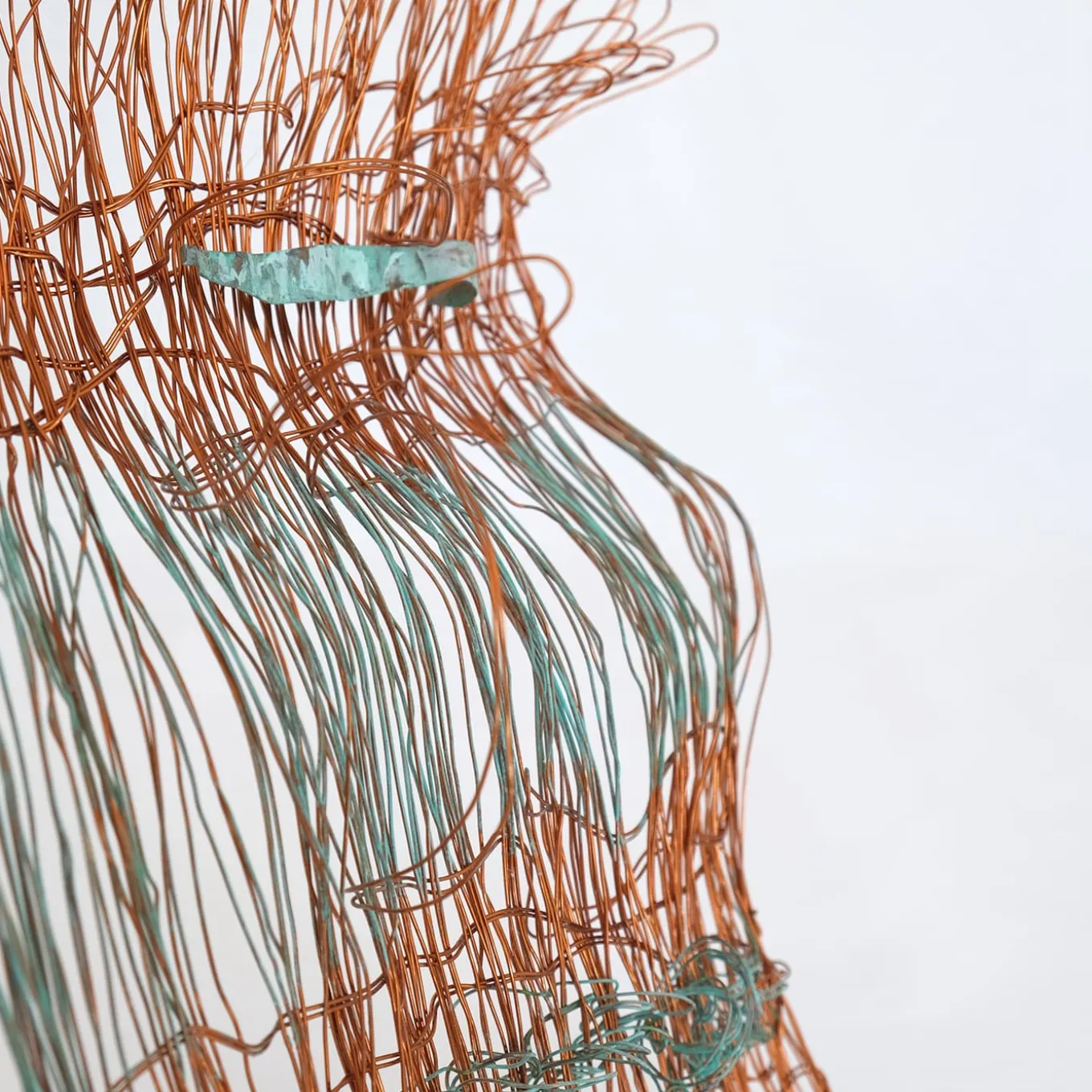 Stunningly handwoven with a traditional loom used for tapestry and rugs, this magnificent sculpture is entirely made of copper threads. A singular oeuvre from the Paesaggi Alchemici Collection, it embodies pure dynamism and movement, enhanced by shaded tones of natural copper and oxidized green. Its shape can be molded and changed according to personal preference or decor needed. Can be showcased both indoors and outdoors.