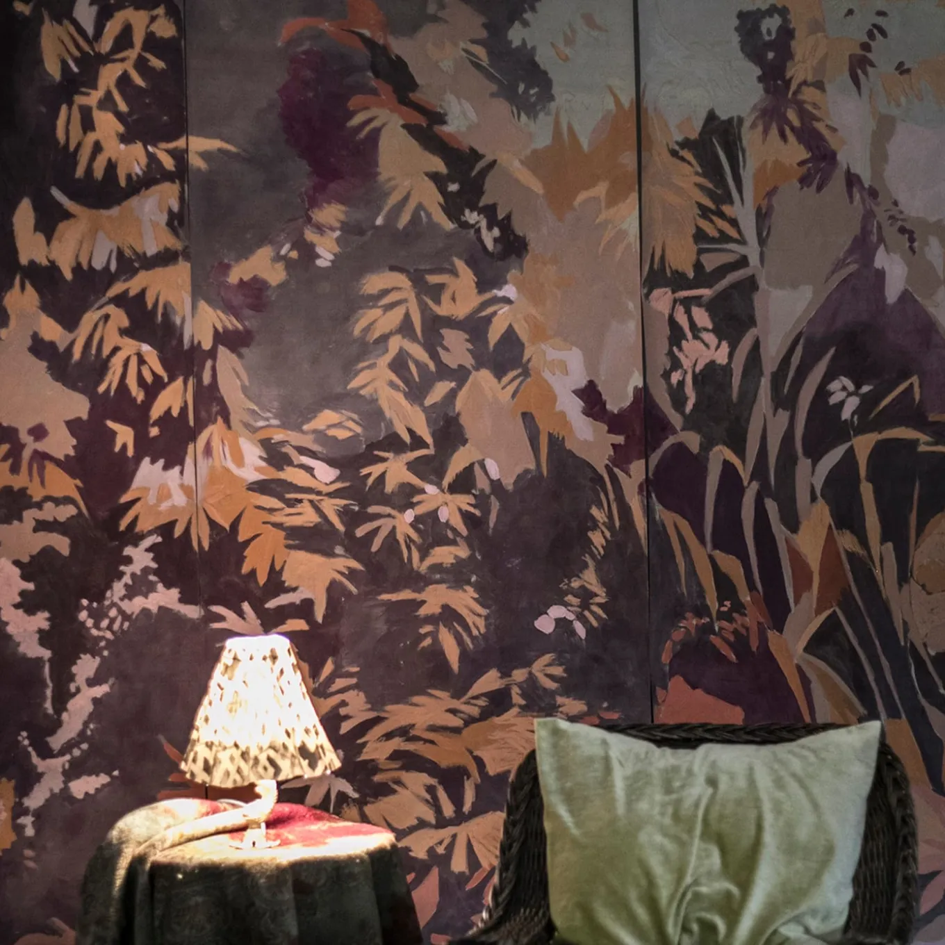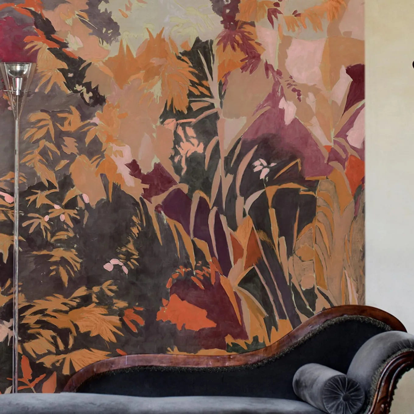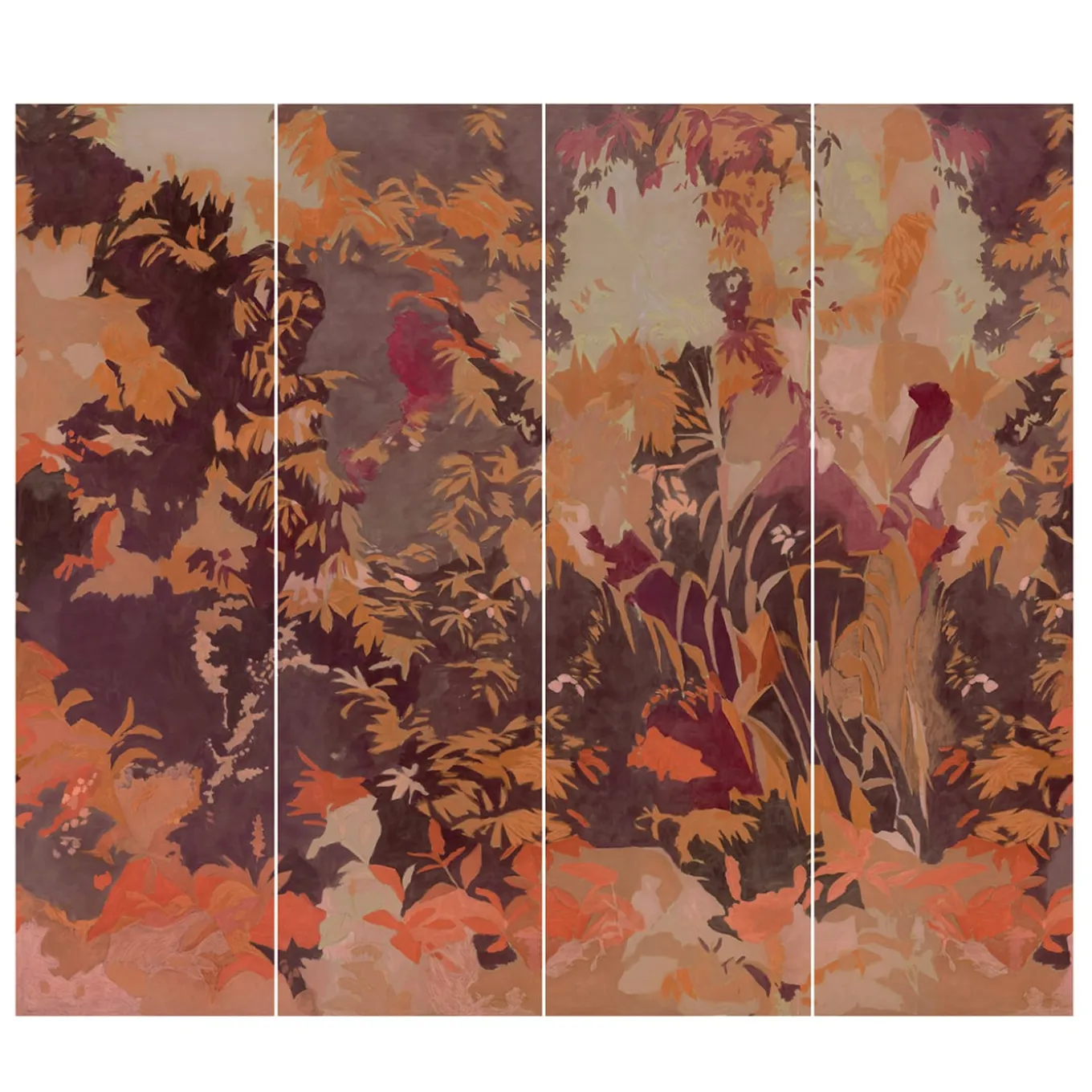 Silk Lurex Printed Wallpaper. The design, featuring vivid shades of red, is inspired by blooming trees in spring and enhanced with warm tones. Printed after an accurate scanning process and meticulous color control, the result maintains a strong continuity with the scale and character of the original hand-painted artwork. Priced per linear meter, with a minimum order of 6 meters and customizable height. Also available upon request in raffia or non-woven backing. For more information, please contact the Concierge.