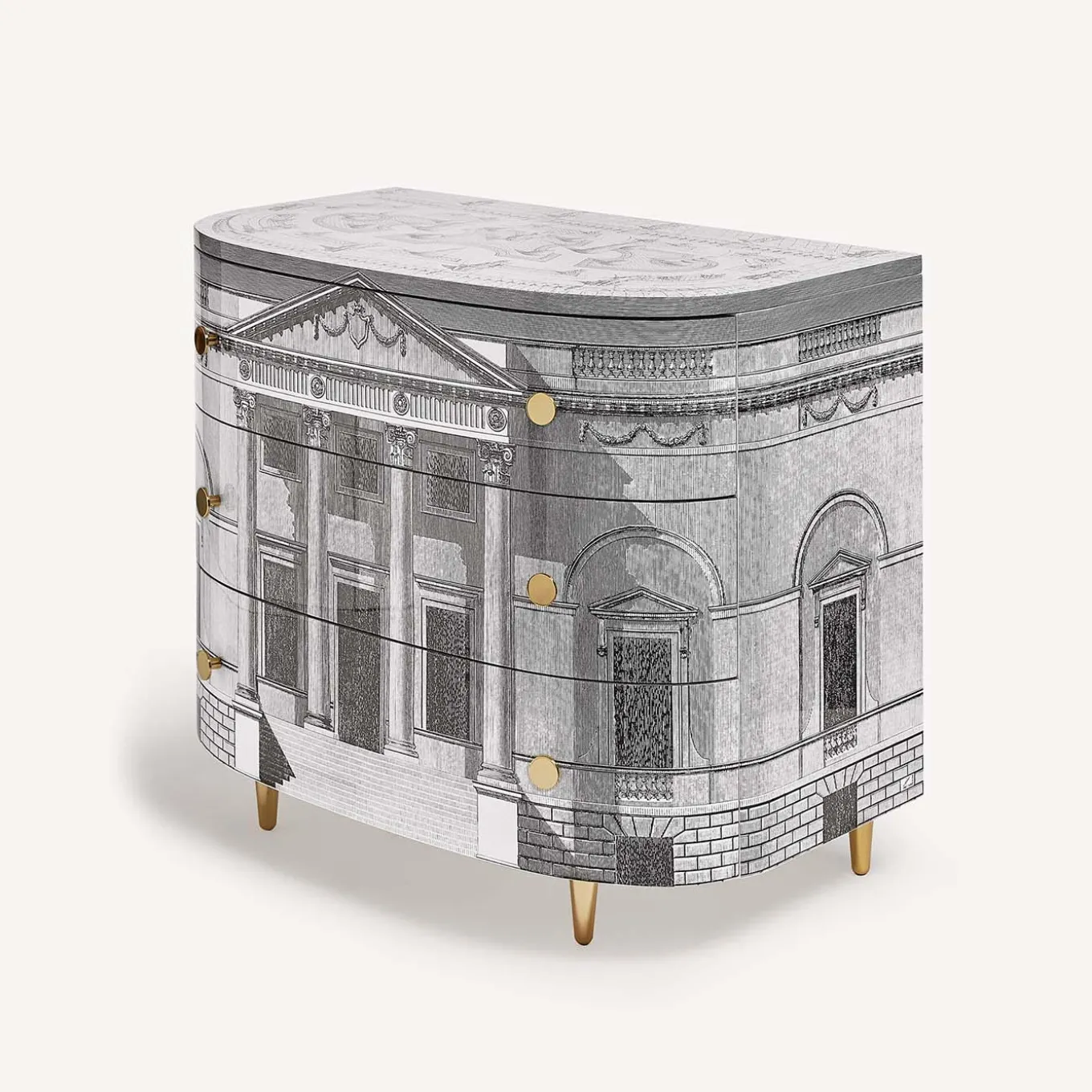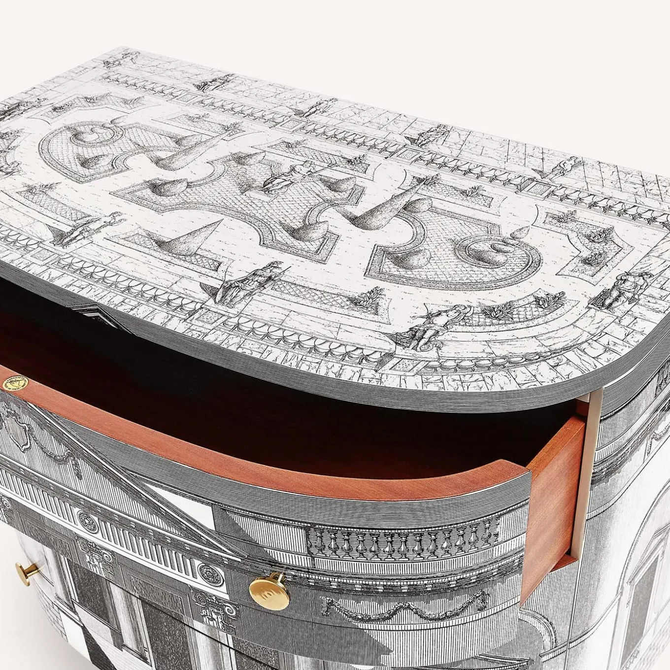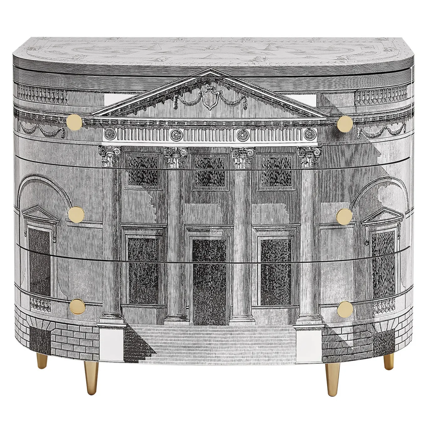 The contrast between the rigorous architectural design and the cabinet’s rounded forms is a tribute to the Neoclassical language of Andrea Palladio. The reproduction of an Italian garden on the top shelf completes this piece of furniture in hand-silkscreened and lacquered wood. Any minor discrepancies between similar creations are the result of craftsmanship and attest to the uniqueness of each product.