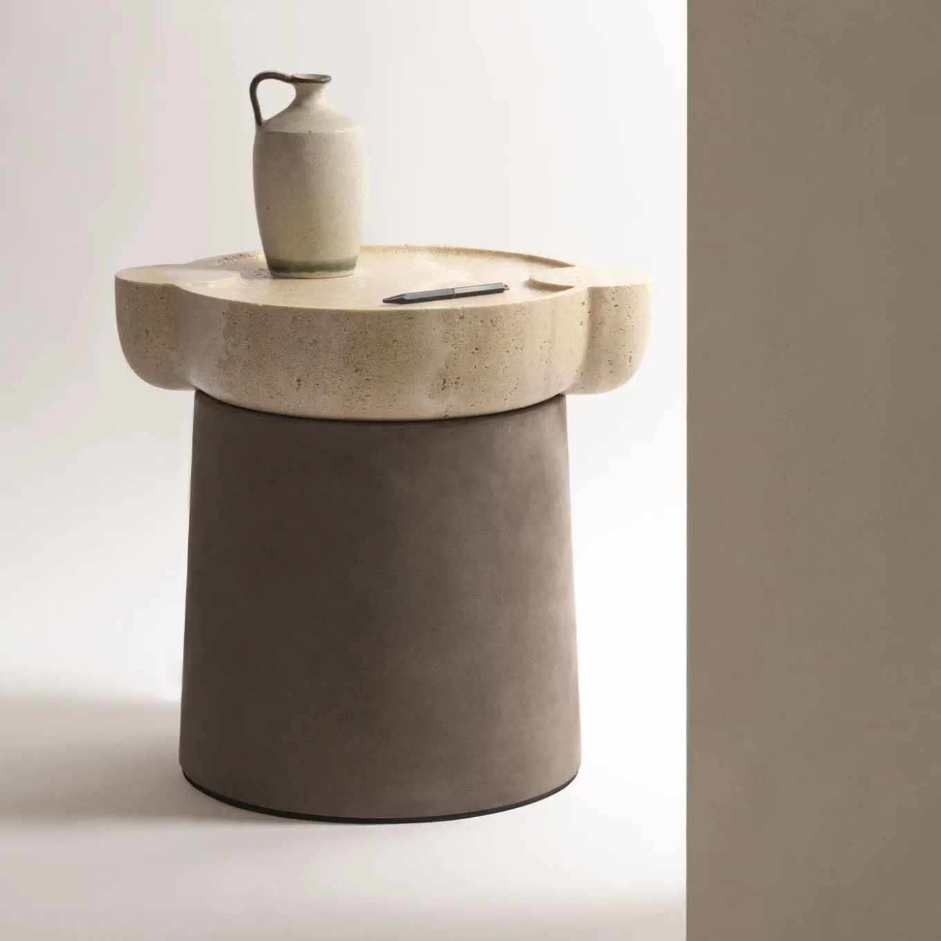 Palladio is a line of side tables that plays with shapes and materials. Minimal bases clad in the finest Italian leather on which essential, clean forms made of travertine with exquisite details lay: with the aim of bringing together the beauty of Classic Art and a Modern, graphic charm, this combination enhances the diversity of textures and colors, resulting in iconic pieces with a magnetic appeal. Custom sizes are available on request.