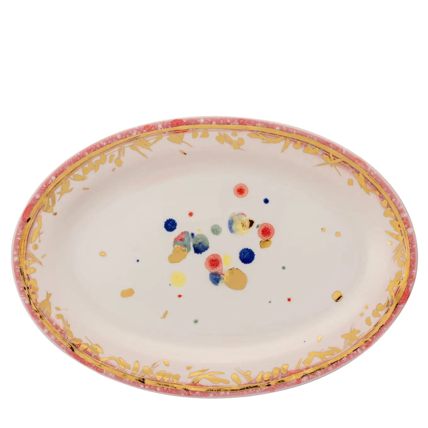 The Palm Beach Platter from the Florida collection is a stunning blend of luxury and cheer, launched in 2023. Inspired by the vibrant spirit of Florida, this bowl features a radiant Palm Beach pink that evokes the beauty of its beaches and sunsets. Its lightly colored center is adorned with multicolor dots, adding a playful touch. The rim is elegantly decorated with golden leaves, enhancing its opulent appeal.