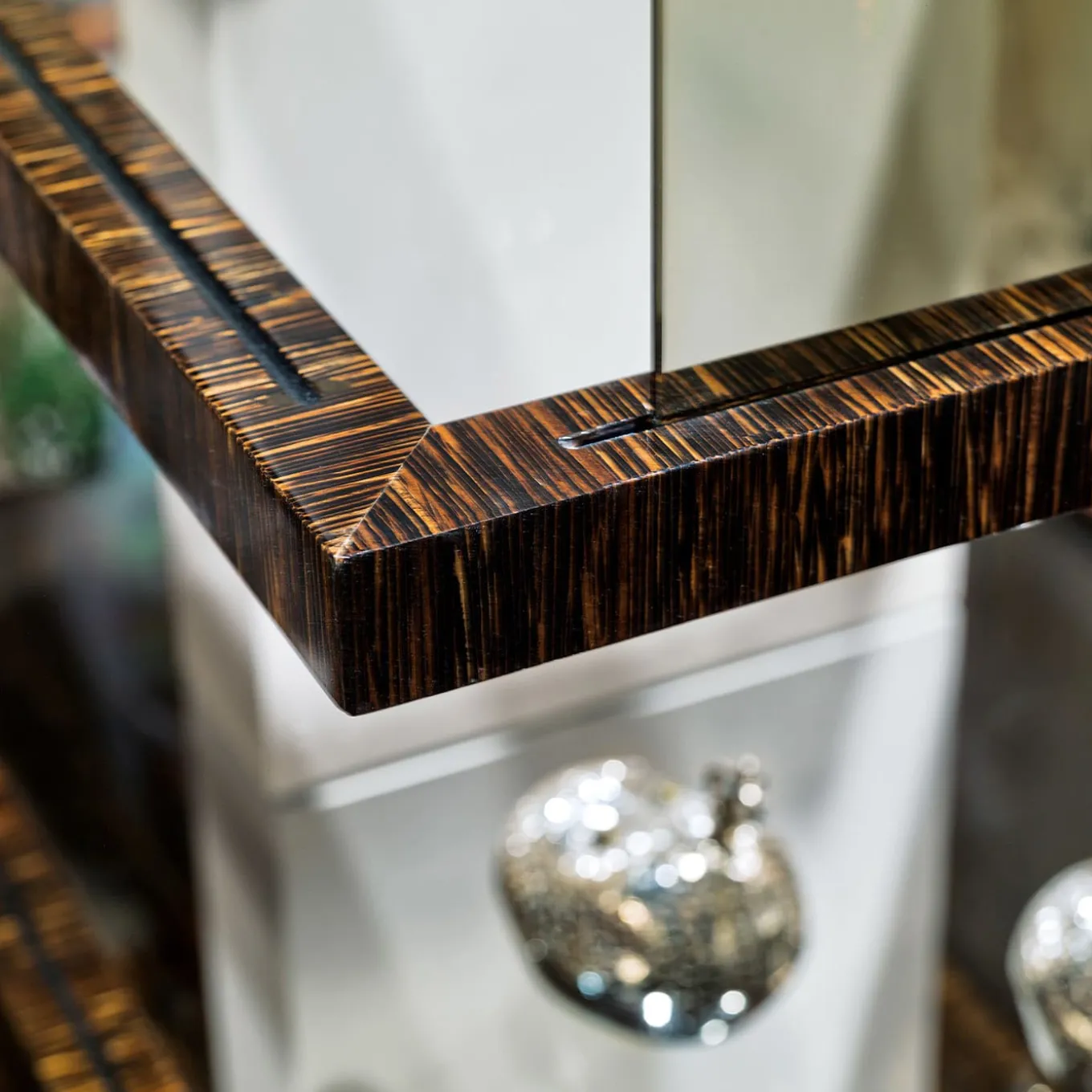 A visually striking, asymmetrical design of iconic character describes this splendid bookcase, fashioned of precious palm wood and enriched with smokey glass sliding panels. The structure is fashioned of lacquered wood. Please refer to the Concierge for further details and possible customizations.
