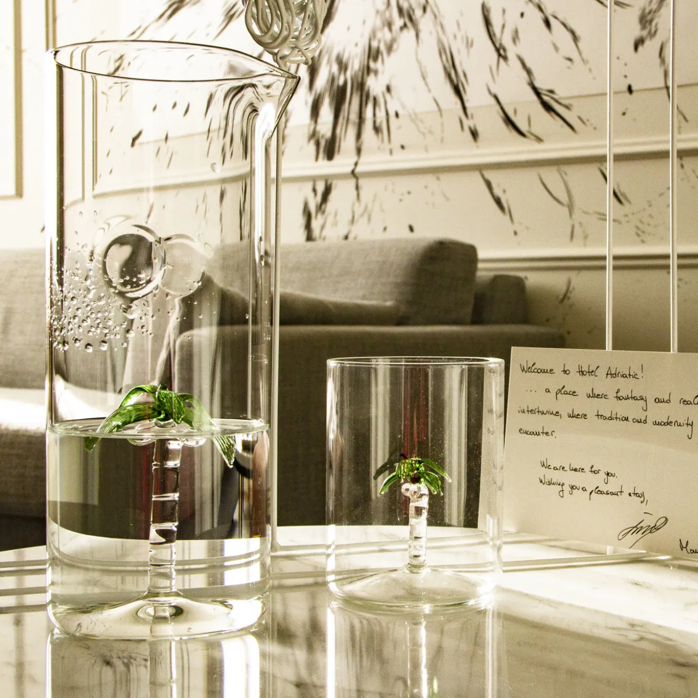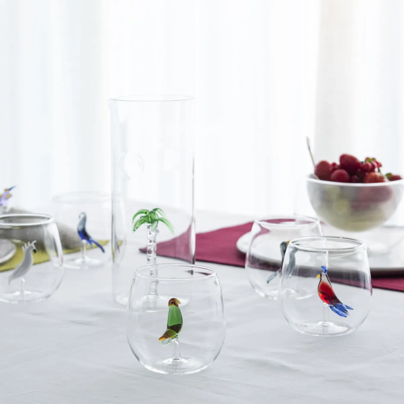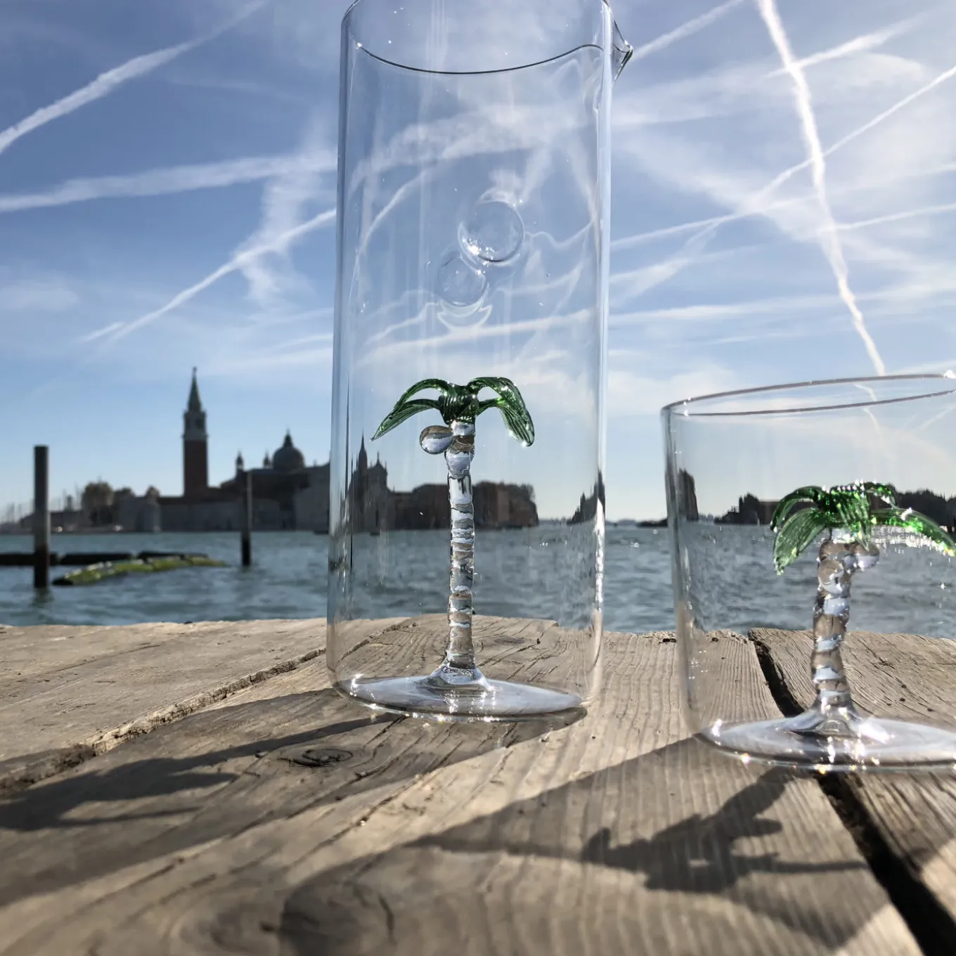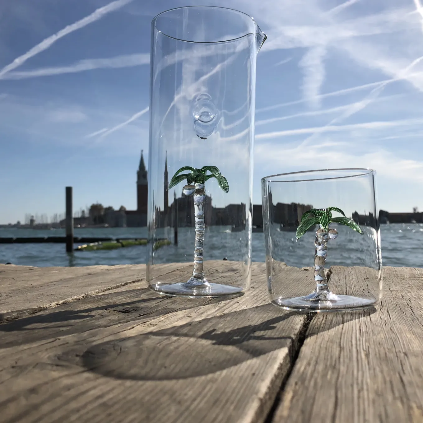 This set of one pitcher and four glasses is adorned with a handmade sculpture of a palm tree hand painted in green. Each object is unique an will be an eye-catching addition on any occasion, particularly if entertaining outdoors in the summer. All the pieces are made of clear, mouth-blown glass. The pitcher is 14 cm in diameter and 25 cm tall , while each glass is 8 cm in diameter and 8.5 cm in height. For a colorful effect, this set can be combined with others in the same tropical-inspired collection.