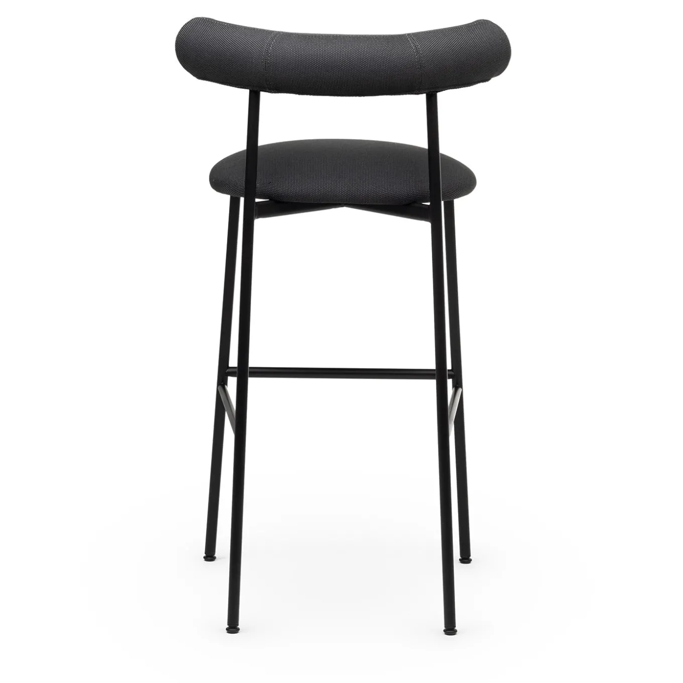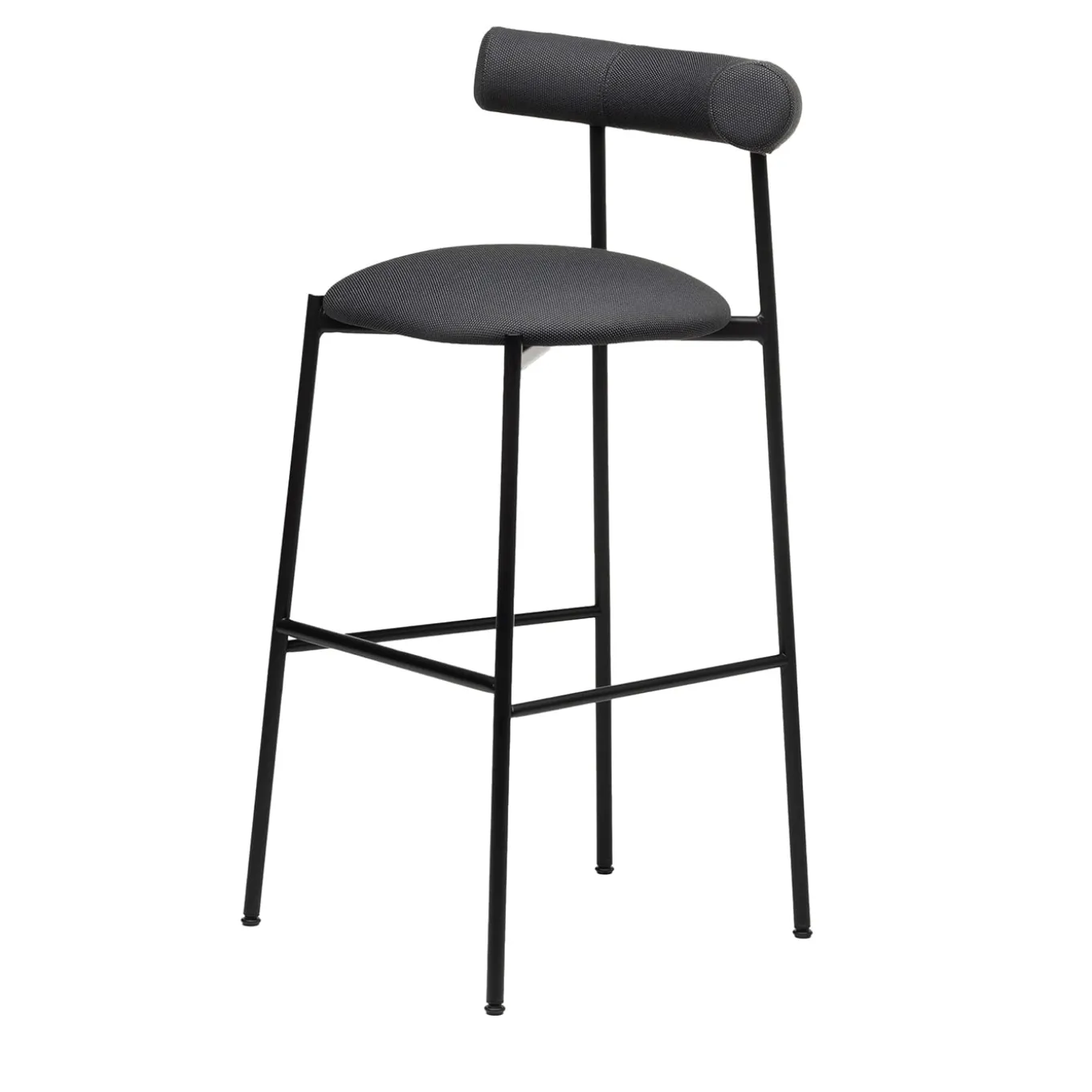 Comfort and minimalism are cleverly synthesized in this stool of modern inspiration. The generous padding characterizing both the embracing cylindrical-cut backrest and the seat ensures impeccable comfort while sipping a drink or having lunch, an effect emphasized by a soft, anthracite-hued upholstery in 100% PET recycled fabric. The slender frame is black powder-coated steel.