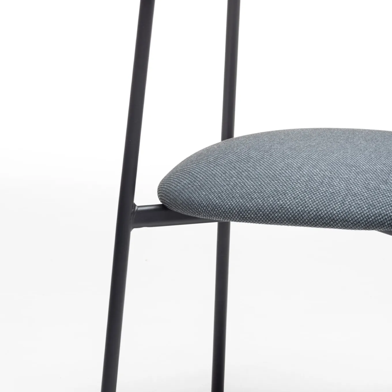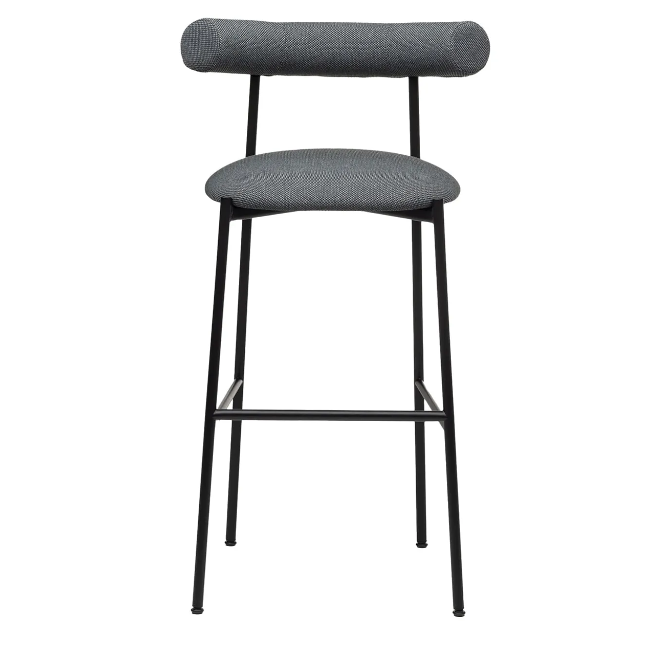 Simultaneously enveloping and sleek, the design of this stool was conceived to satisfy functional needs while maintaining a quiet modern elegance and comfort. The slender steel frame flaunts a deep black finish obtained through powder coating, while the plump seat and curved cylindrical-cut backrest are upholstered in a gray-toned 100% recycled fabric. Variants are available in the Artemest catalog.