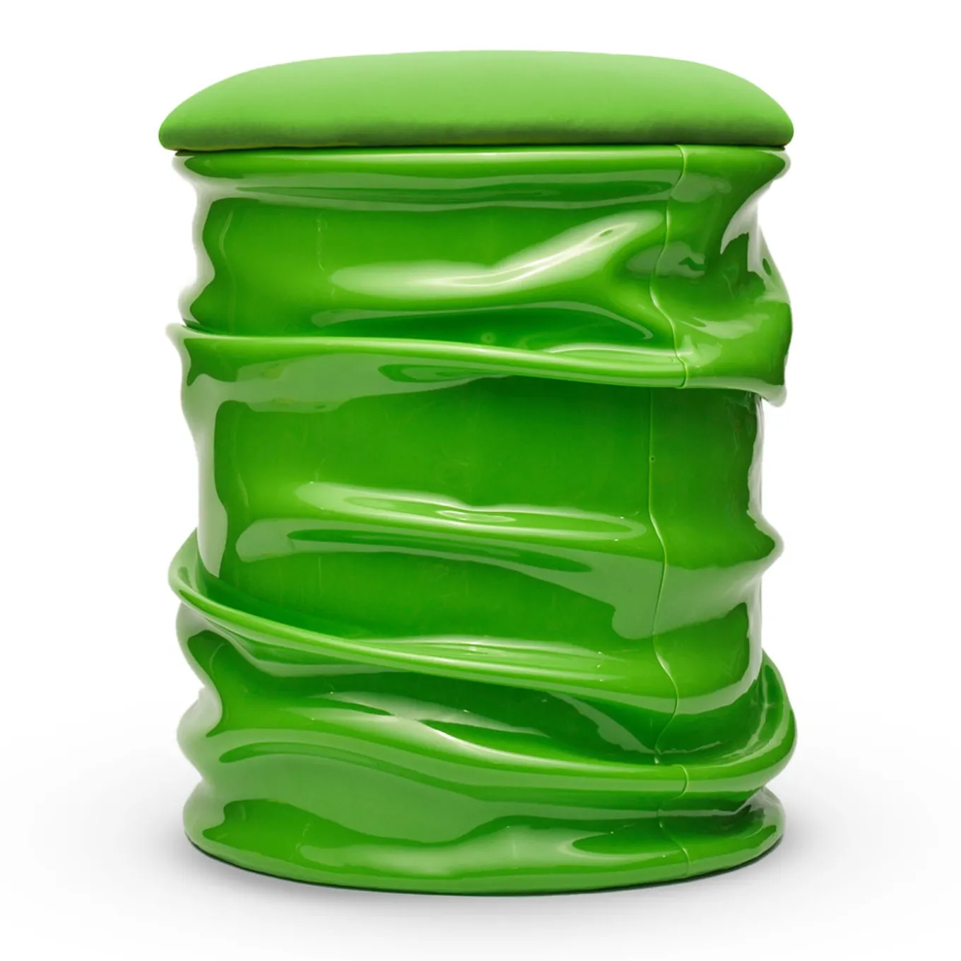 Distinguished by a vivid and polished green hue, this elegant pouf combines function and style in a singular silhouette of captivating visual allure and utmost comfort. Handcrafted of high-quality resin, it is available in a variety of custom colors and fine fabrics, enhancing its flowing and harmonious shape topped with a soft, comfortable cushion.