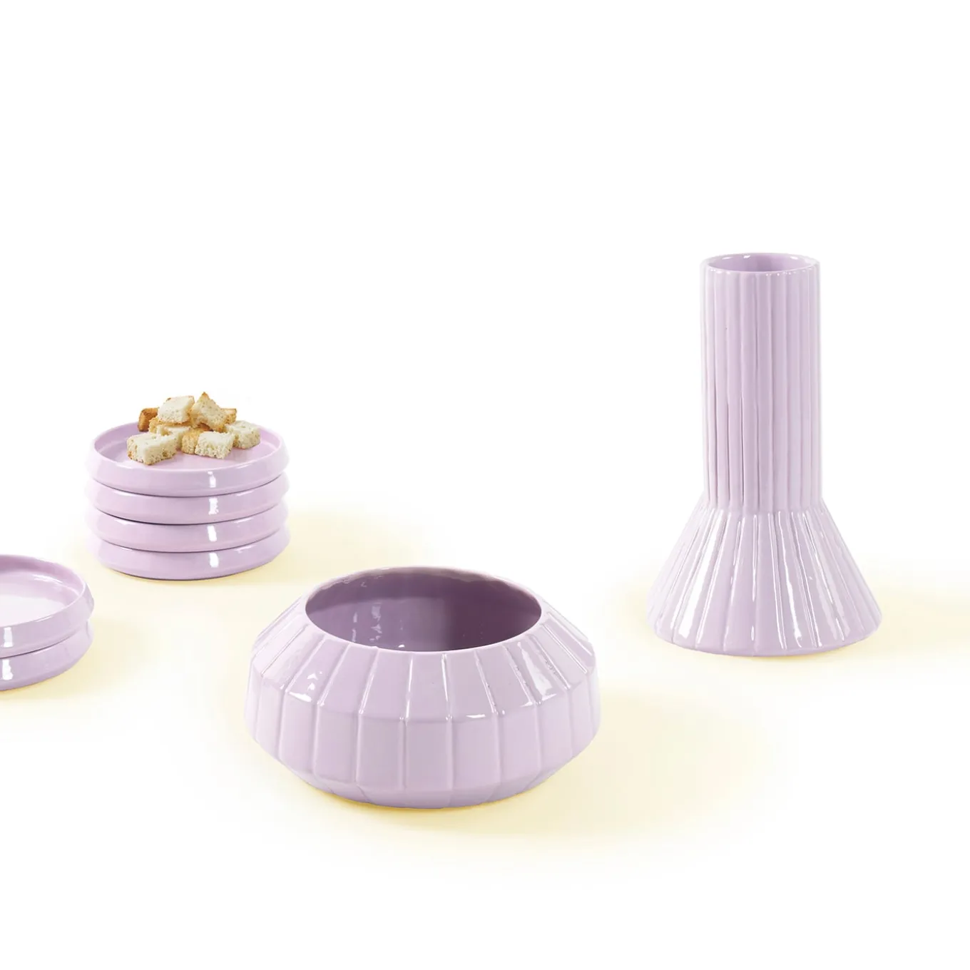 Stackability, crucial in post-war design, maximizes function in compact spaces. Today, it embodies essentialism by prioritizing core values and waste reduction. Bread and wine symbolize discipline and optimism. The stackable service thus becomes a table totem, a whole that composes a figure in its parts, encouraging communal sharing, a timeless ritual that nourishes both body and spirit, reflecting human connection through food.