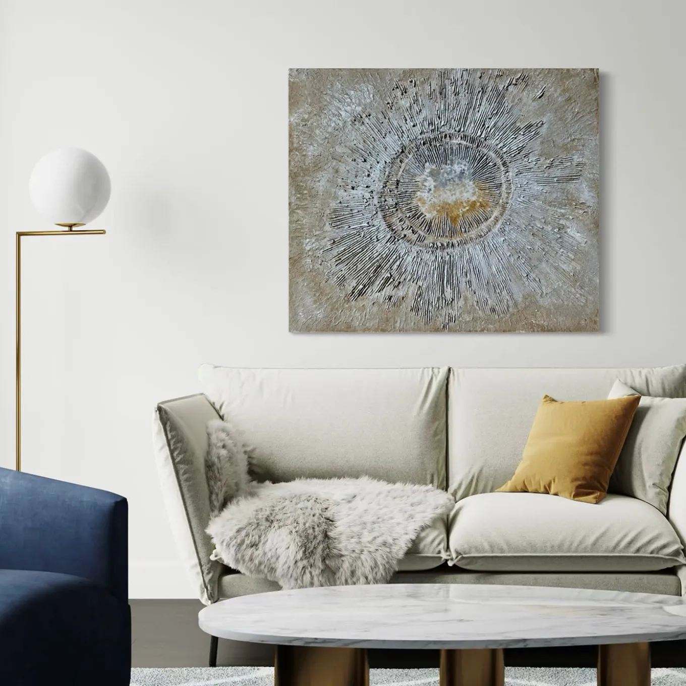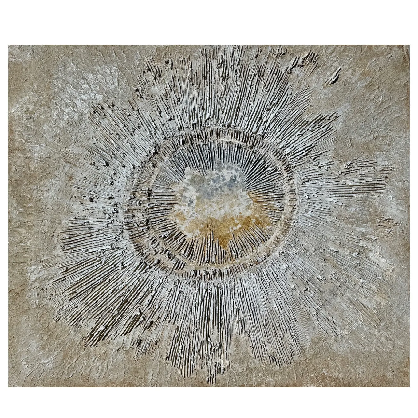 Inspired by the meeting of man and marine life, this one-off piece by Mara Fabbro features a central, radiating shape, whose texture and grit gives the illusion of movement. It is entirely crafted using a sandy mixture and ochre and blue pigments, most evident in the central ring. This piece will undoubtedly shine in an eclectic and modern interior, where it can be admired by artists and afficionados, alike. Each painting is unique.