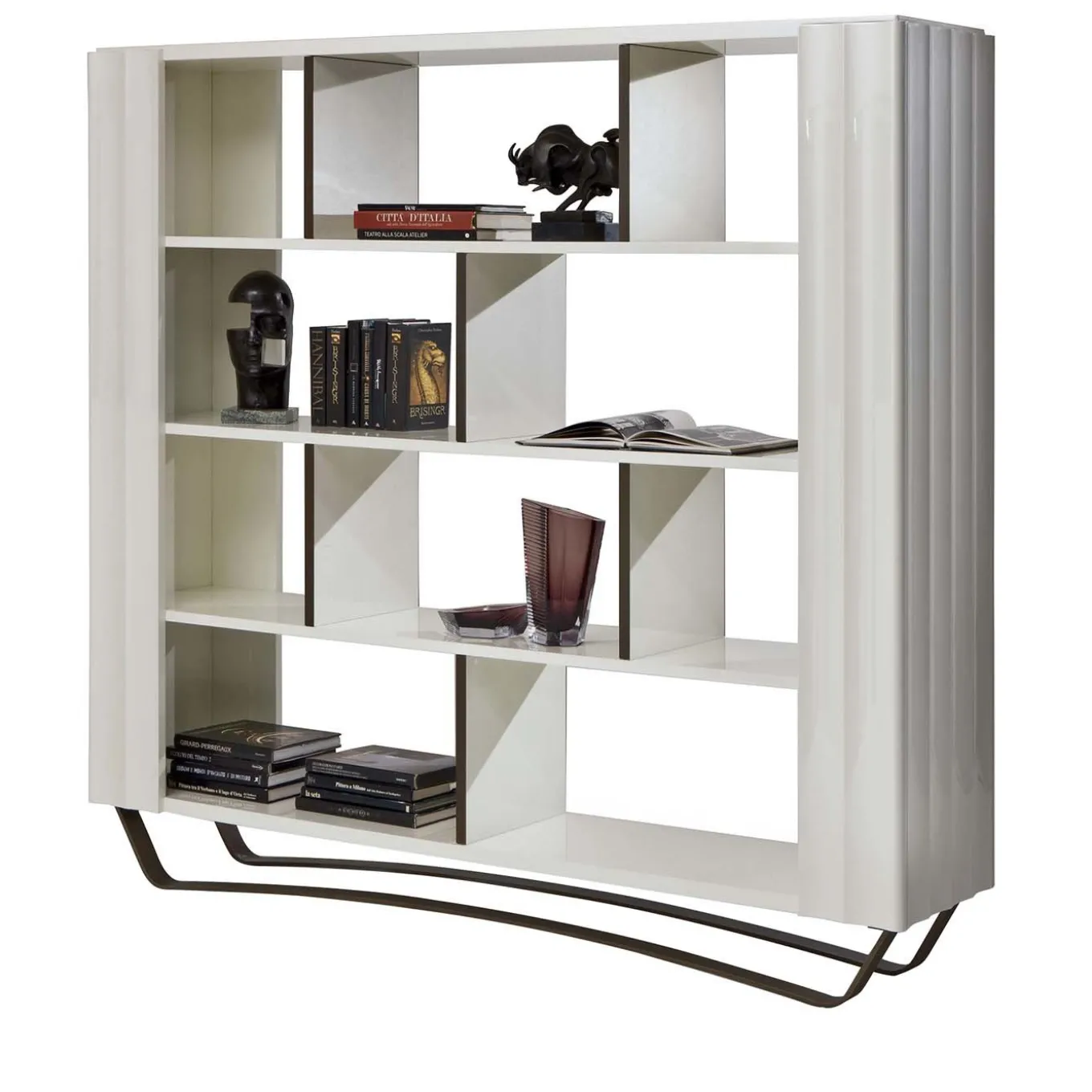 An architectural construction that evokes the classic grace of Corinthian columns, this bookcase has an open frame made of wood with white lacquered finish. Three horizontal shelves are interrupted by randomly placed vertical panels that create an irregular division of the space in an eye-catching pattern. The base is composed of two curved metal slats with a bronzed finish echoed in the front details of the vertical panels. A prominent element in any living room, this bookcase can be used freestanding to create a spatial and functional division in a loft.