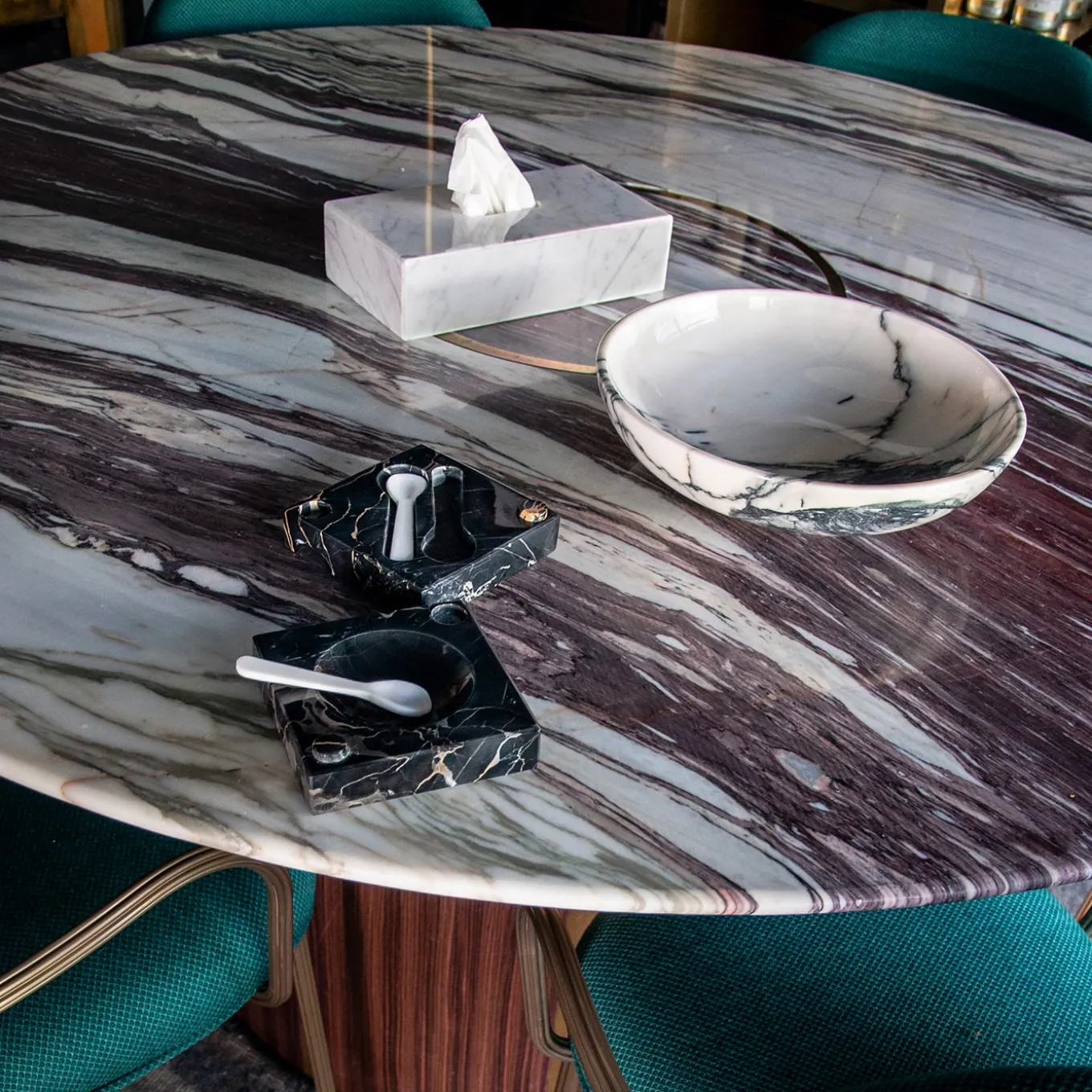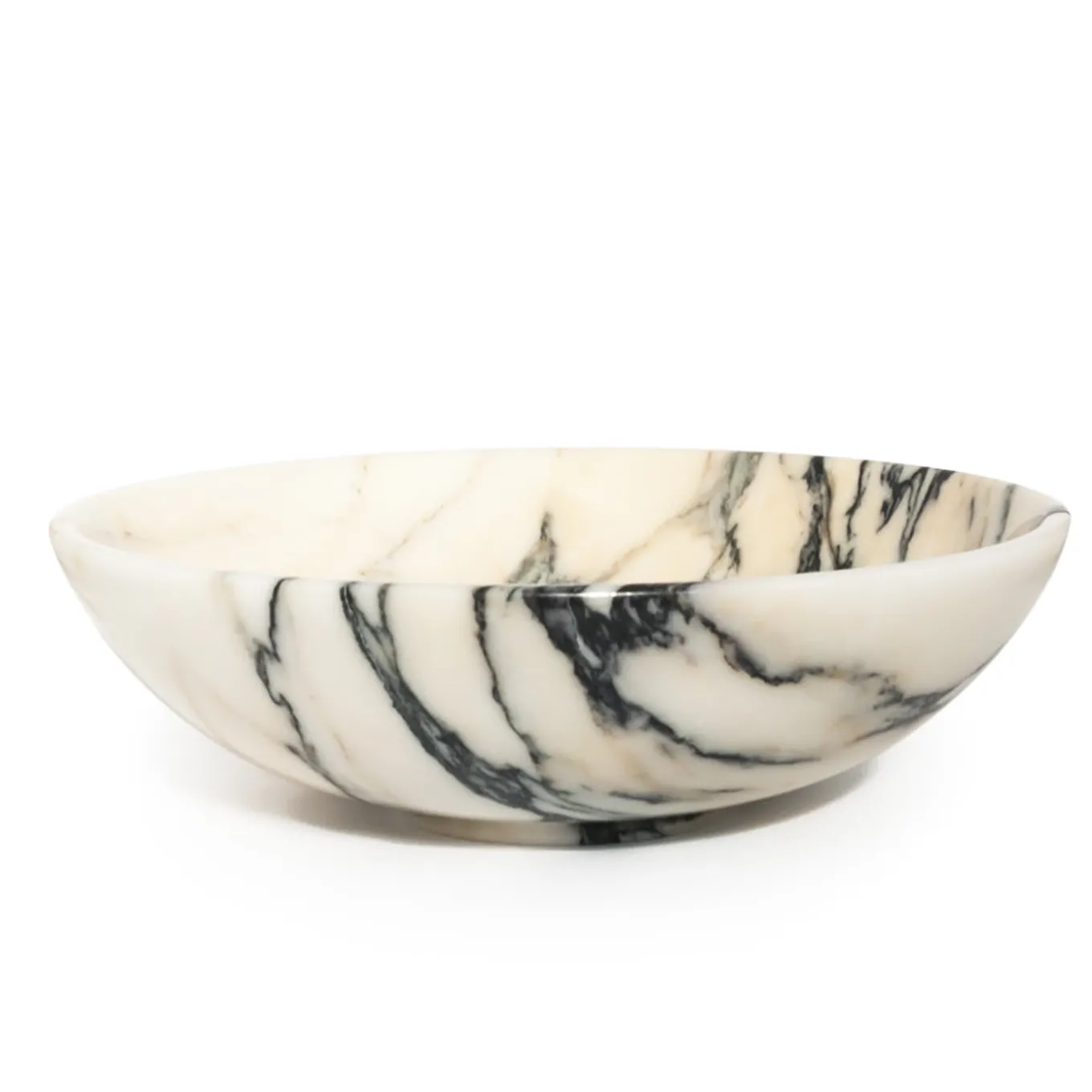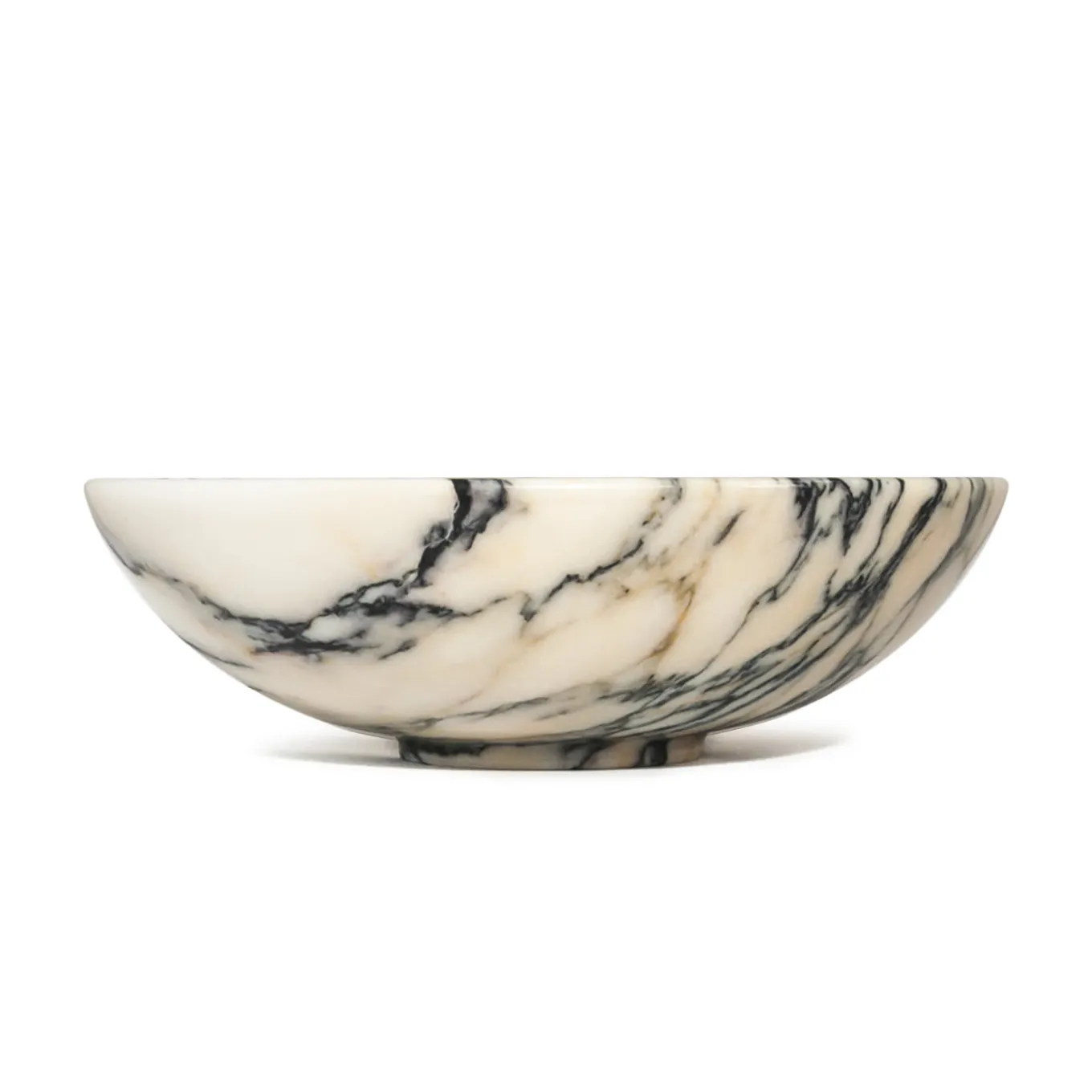 Aesthetic appeal and meticulous crafting render this rounded fruit bowl a one-of-kind piece that will stand out in contemporary decors. Fashioned of Paonazzo marble, showcasing a beige color with intense black veins, it is at once functional and decorative. The use of prized marble contributes to the uniqueness of each product.