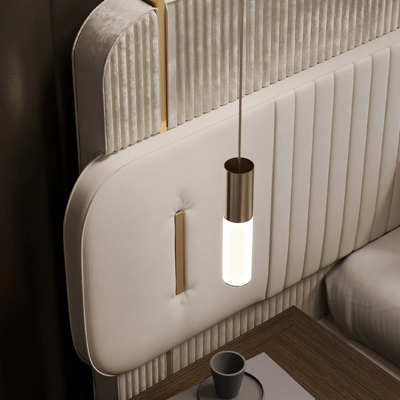 An exclusive statement piece for a refined contemporary interior, this gorgeous bed combines clean and minimalist lines with a subtly lavish flair. Softly padded, its wooden structure is upholstered with cream white leather, uniquely adorned with satin brass-finished metal inserts on the headboard and with differently sized pipe stitching adding a pleasant sense of movement to the piece. Customizable in size, finishes, and upholsteries, please ask the Concierge for details and options.