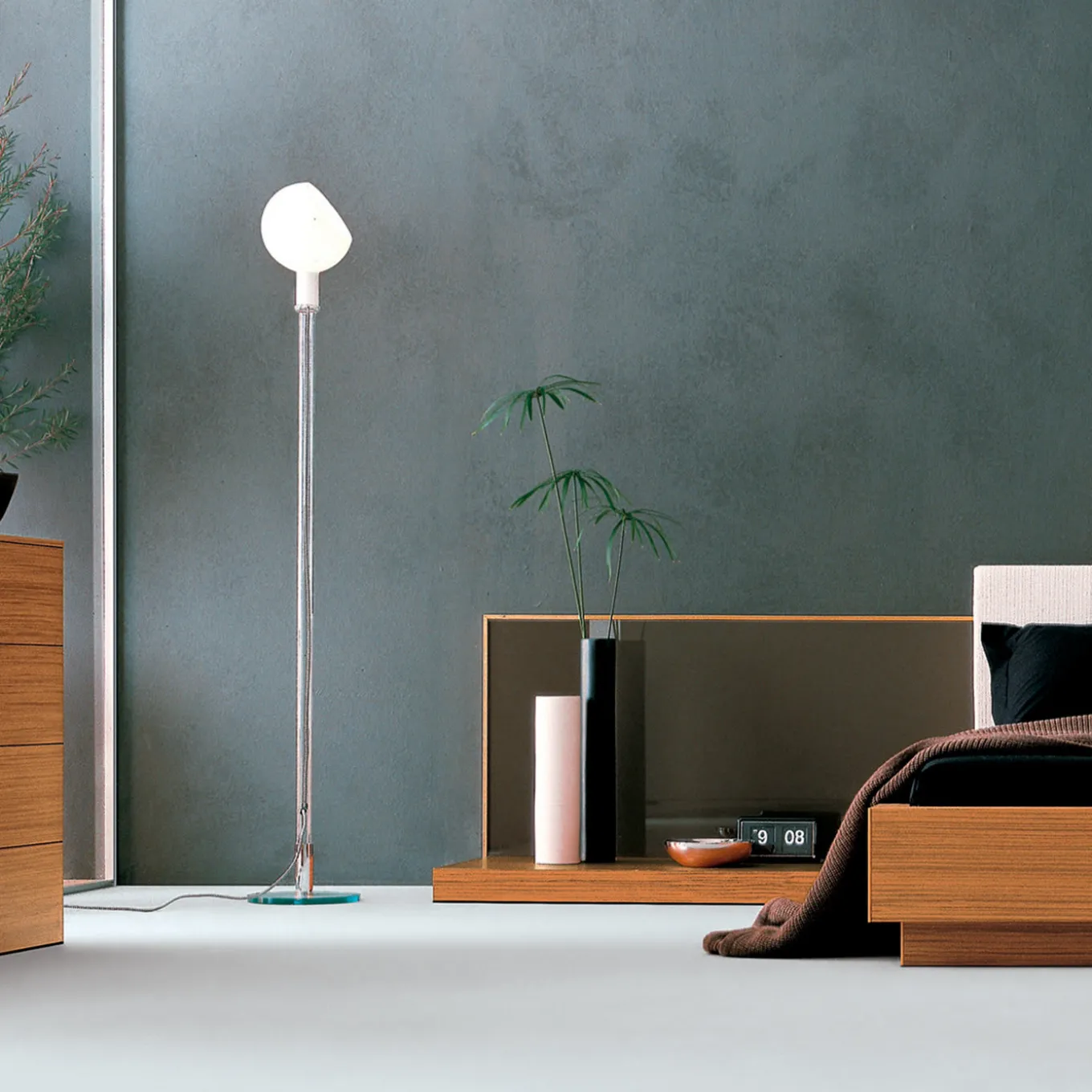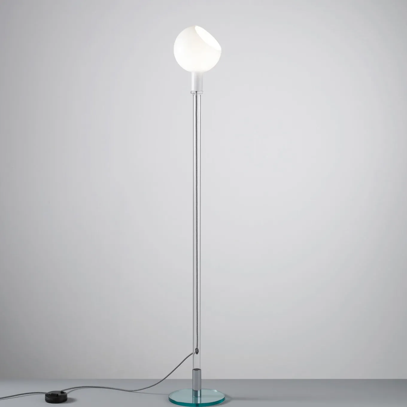 Designed by Gae Aulenti and Piero Castiglioni, this masterpiece is a perfect mix of artisanal craftsmanship and industrial efficiency. The polished-glass base with a borosilicate glass stem creates the illusion of the spherical shade floating in midair. The shade is in opaline-finished mouth-blown glass. The bulb is a 205 W halogen B15d. This item is only wired for 220V and it is sold with an adapter.
