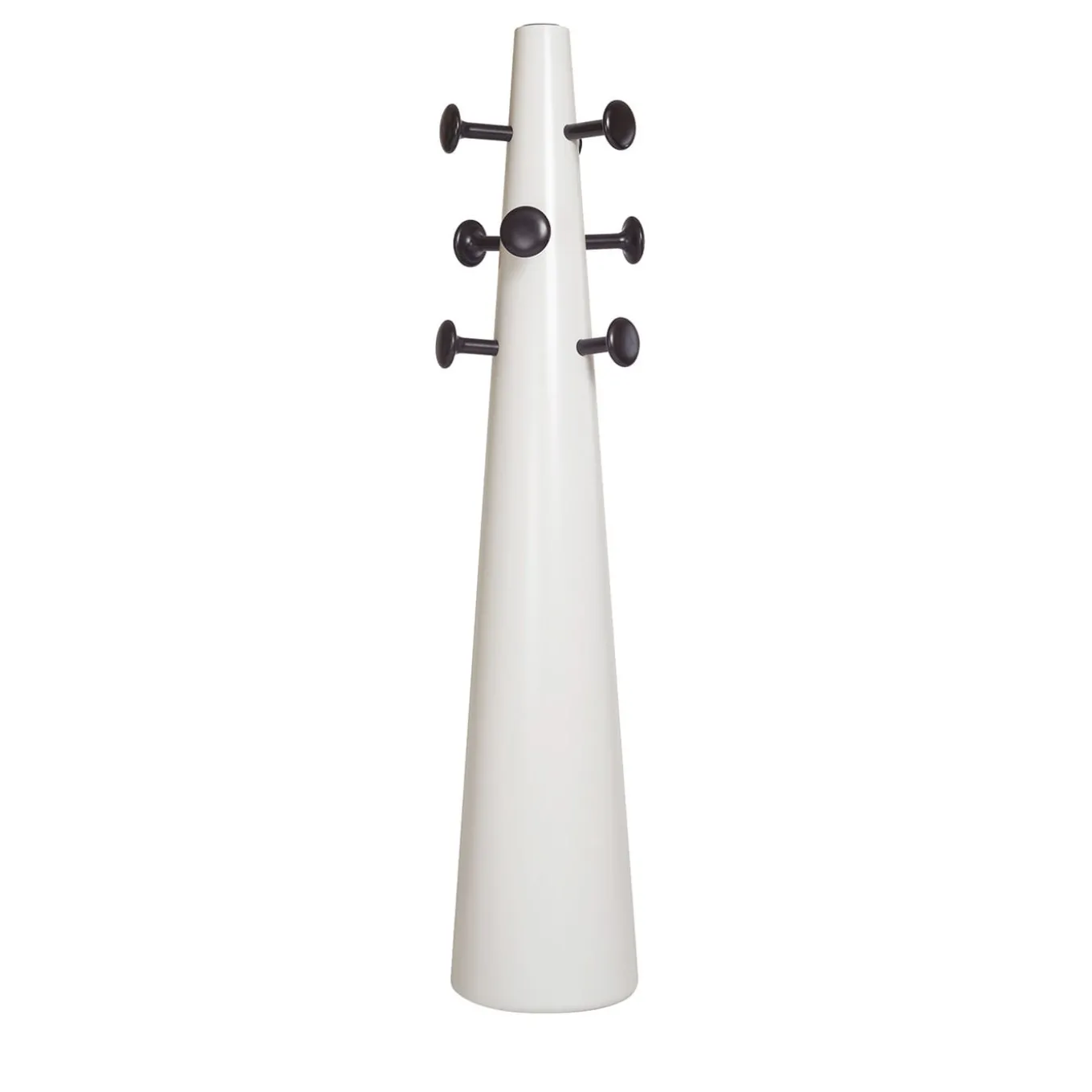 The Particella coat hanger retains the juxtaposition of momentum and gravity of its inlaid version while featuring a matt lacquered polyurethane body in new colors and matte black lacquered wood knobs. It is part of the New Atomic Age collection designed by Elena Salmistraro. The designer took inspiration from the historical period between the 1940s and 1960s. The collection reflects neo-tribal and post-atomic symbols through precious inlays and innovative resin carvings.