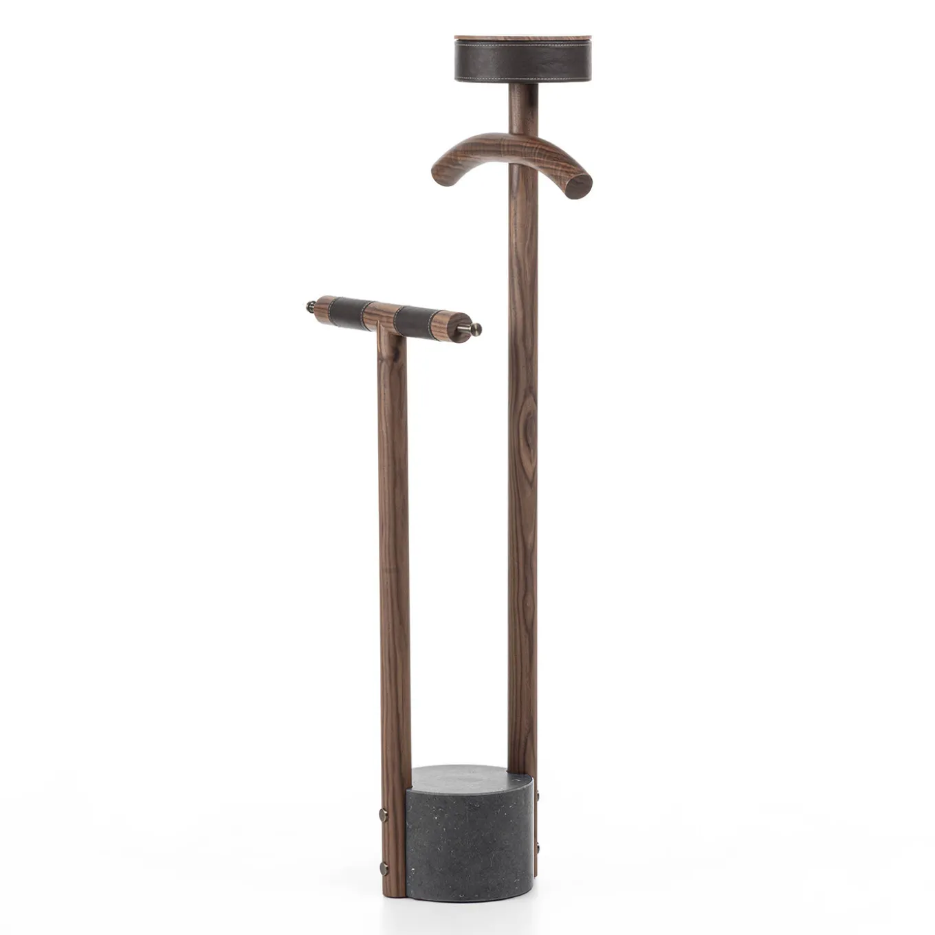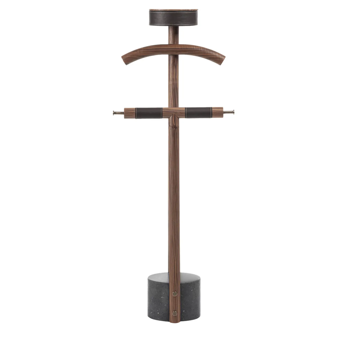 Patrick walnut wood clothes stand features a Marquina marble base supporting a thoughtfully designed structure with a pants holder wrapped in leather and equipped with two bronze supports suitable for belts and ties. The top section integrates a high-quality leather-lined storage box with a solid wood lid, combining functionality with elegant materials and refined detailing.