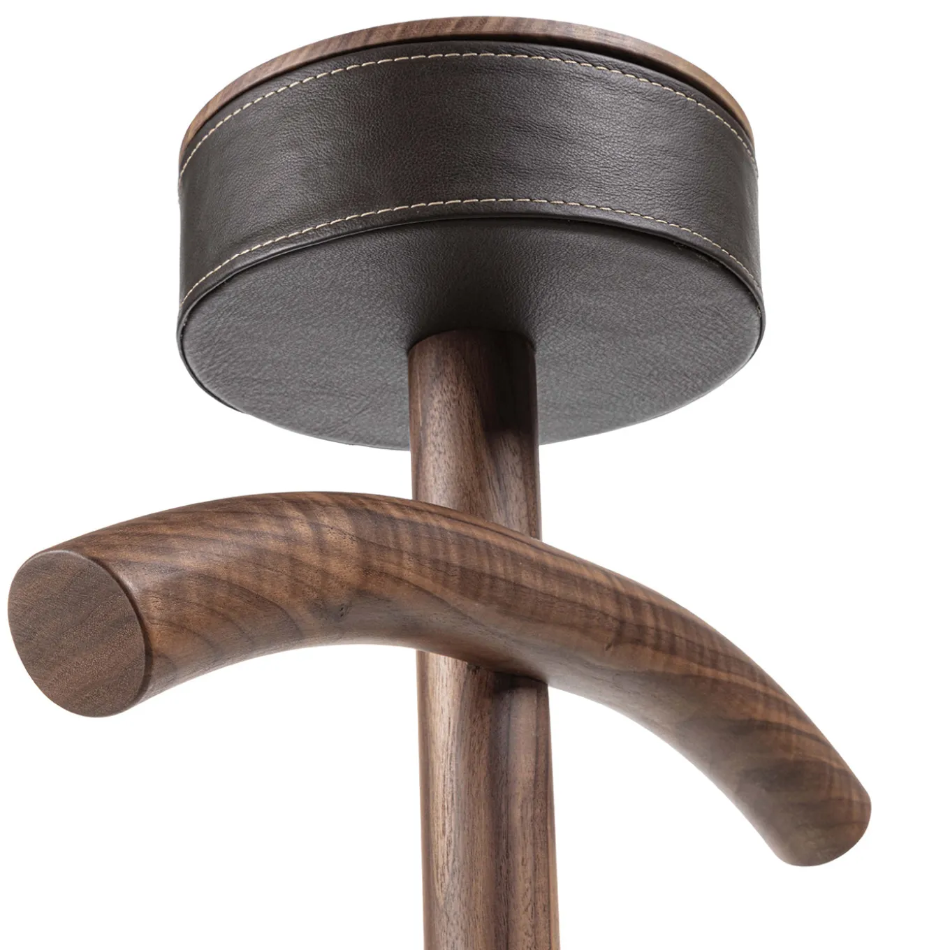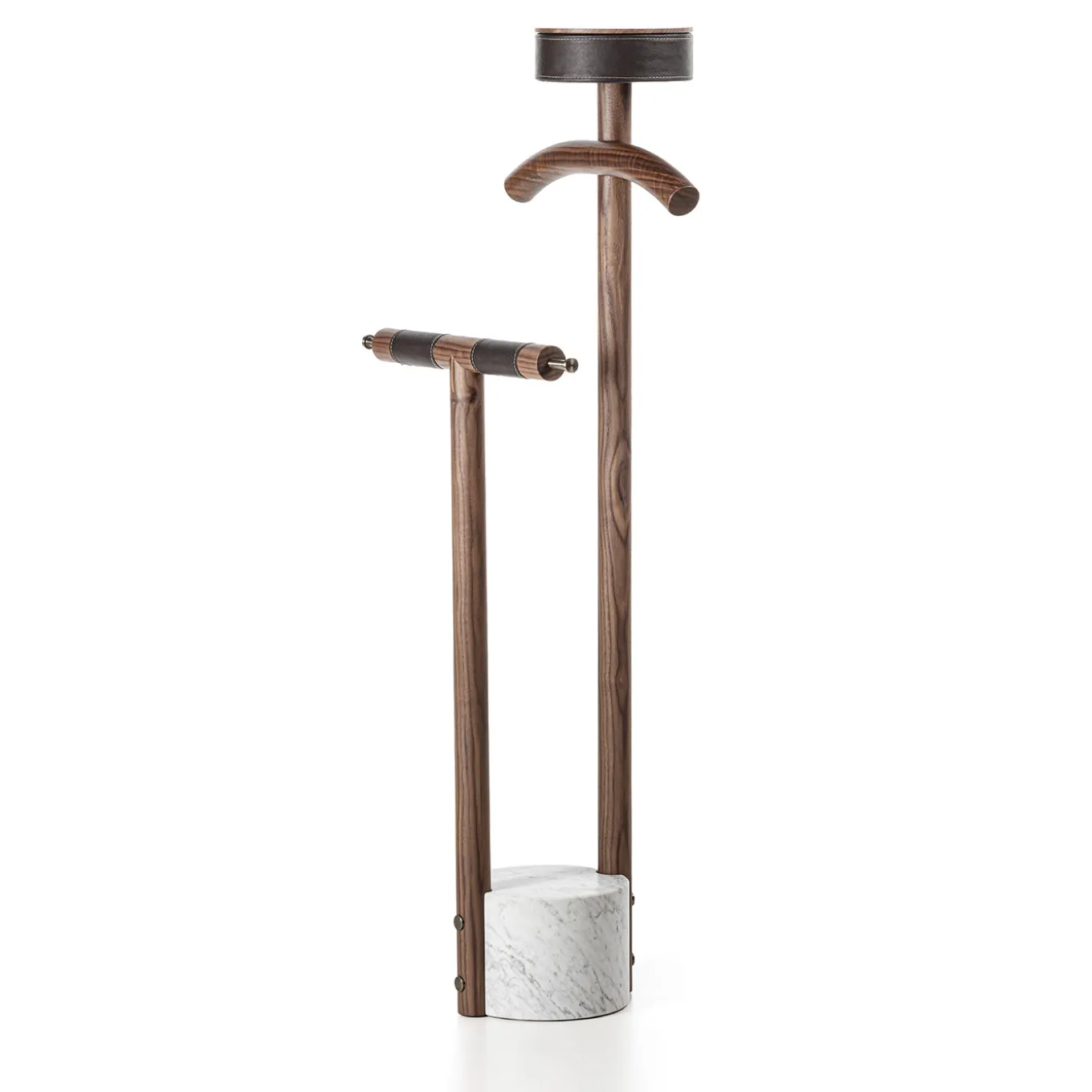Valet Stand featuring a white Carrara marble base supporting a solid walnut frame with an integrated trouser rack adorned with leather accents and two bronze holders for belts and ties. The upper part includes a high-quality leather-covered storage box with a solid wood lid, combining functionality with refined materials for an elegant and practical addition to an entryway or dressing area.