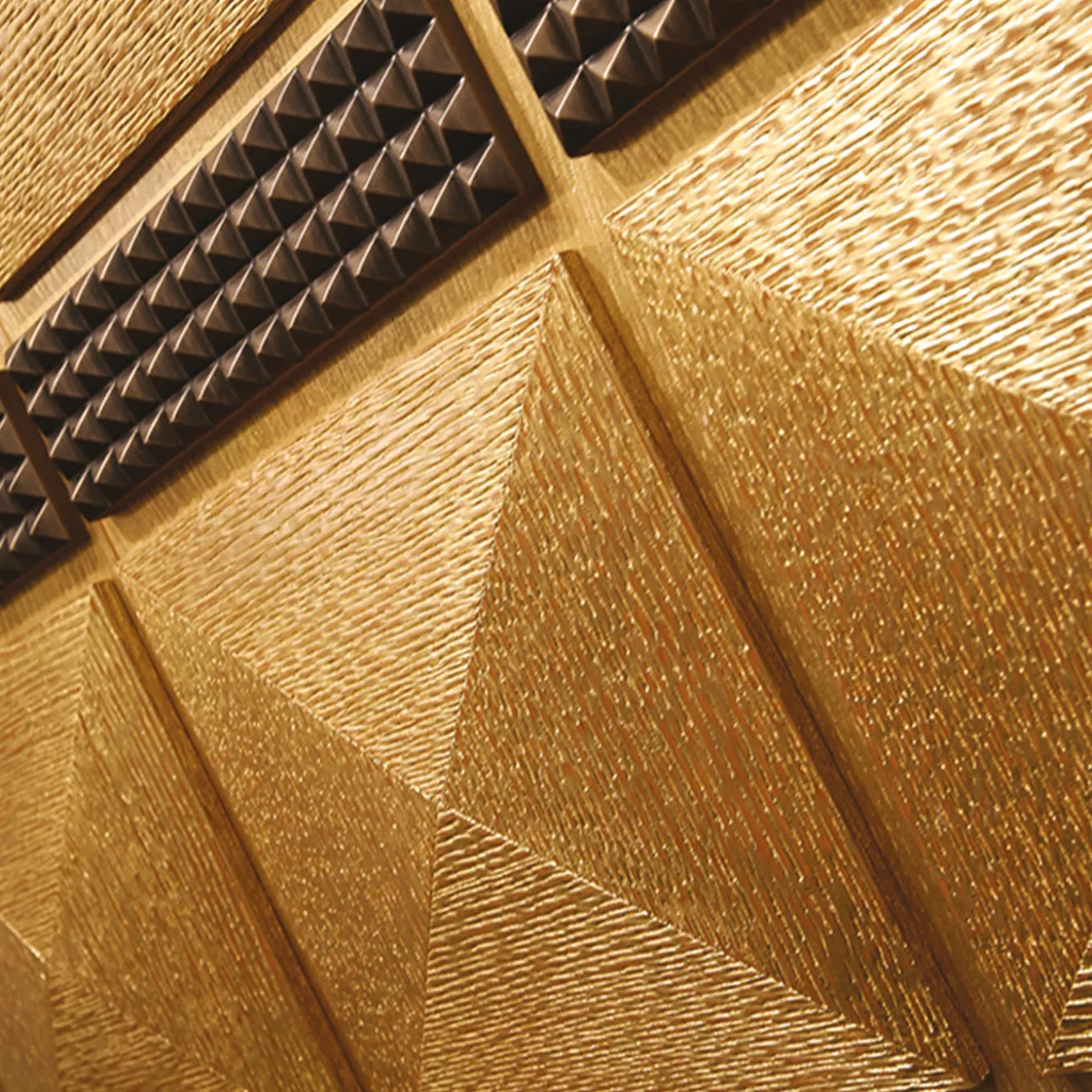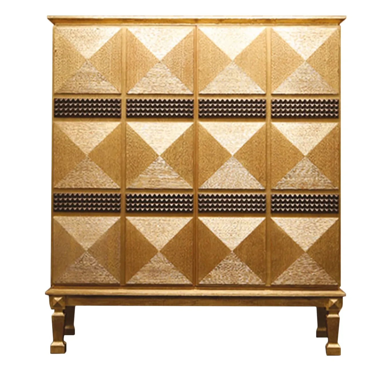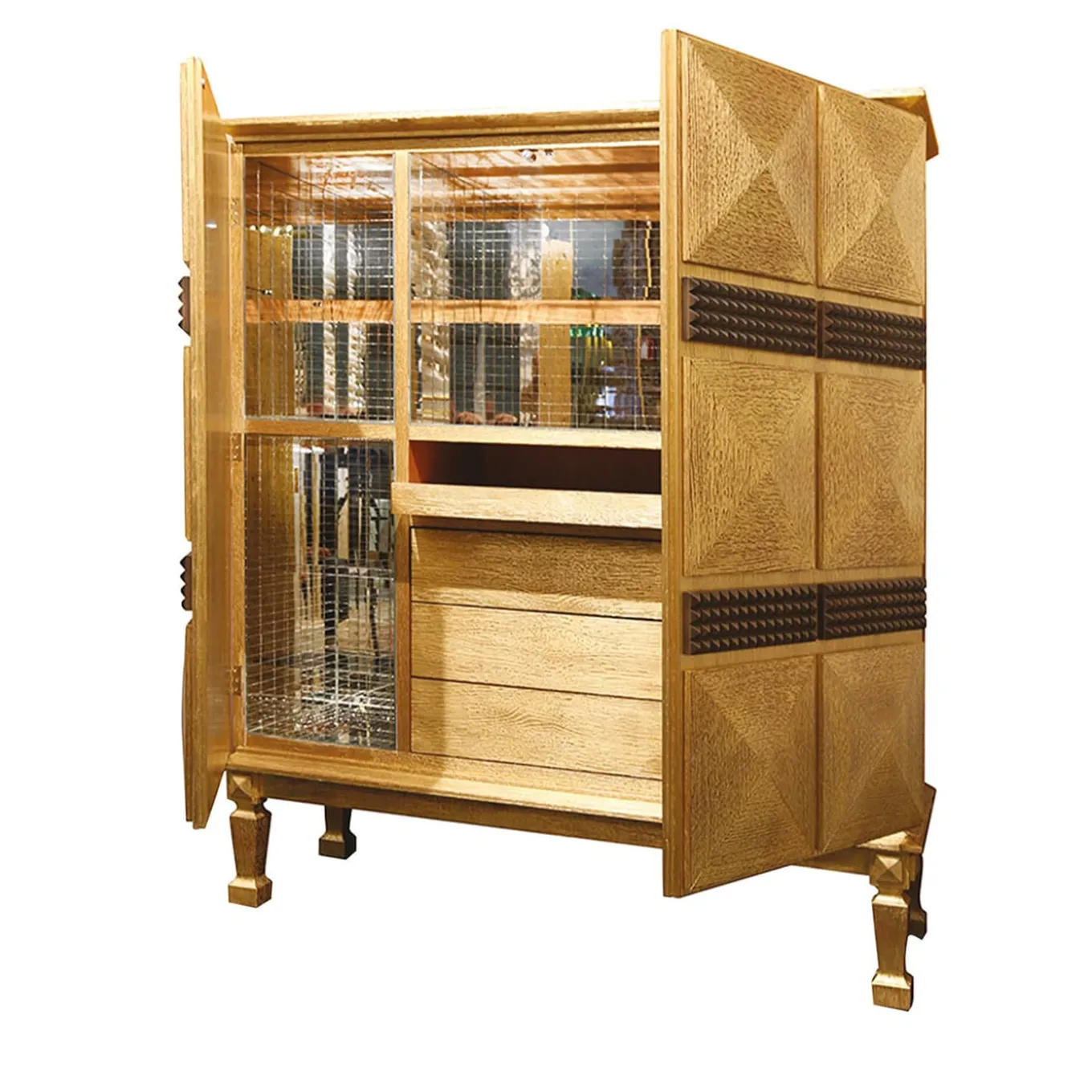 Stately and sultry, this bar cabinet will effortlessly fit in a sophisticated, Art Deco-inspired living room. The imposing structure standing on four sculpted feet is fashioned of pickled oak and extensively covered with prized gold leaf for a luxe look. Two doors with raised designs of pyramids open to reveal the ample storage compartment, equipped with drawers and units with glass shelves where to collect refined glassware collections are rare liqueurs.