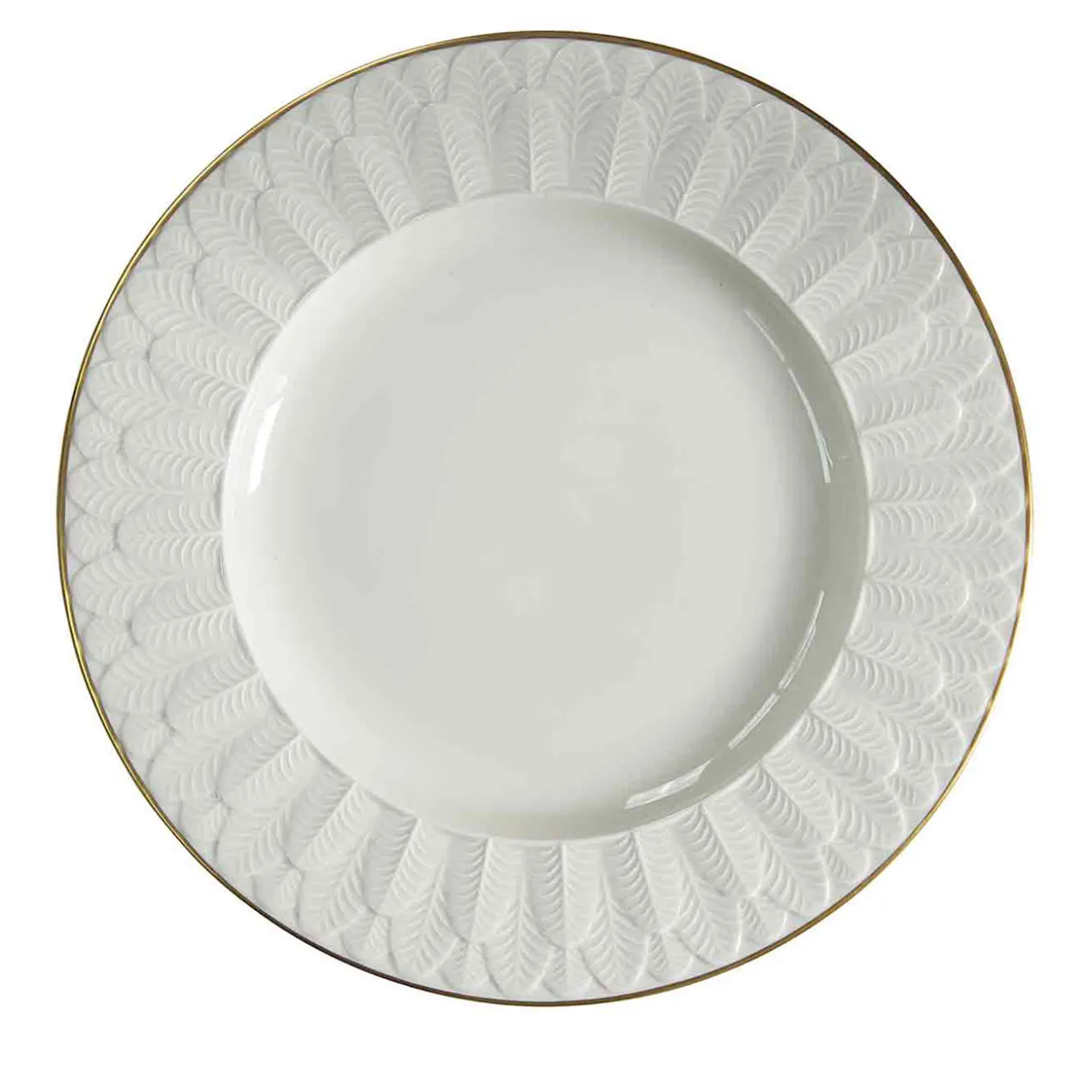 This 27 cm dinner plate features an embossed peacock feather pattern around the rim, adding refined texture and a subtle decorative touch. The plate’s white surface is contrasted by a delicate gold trim along the edge, enhancing its elegance. Designed for medium-sized servings, it combines classic sophistication with understated detailing, making it suitable for both everyday use and formal dining settings.