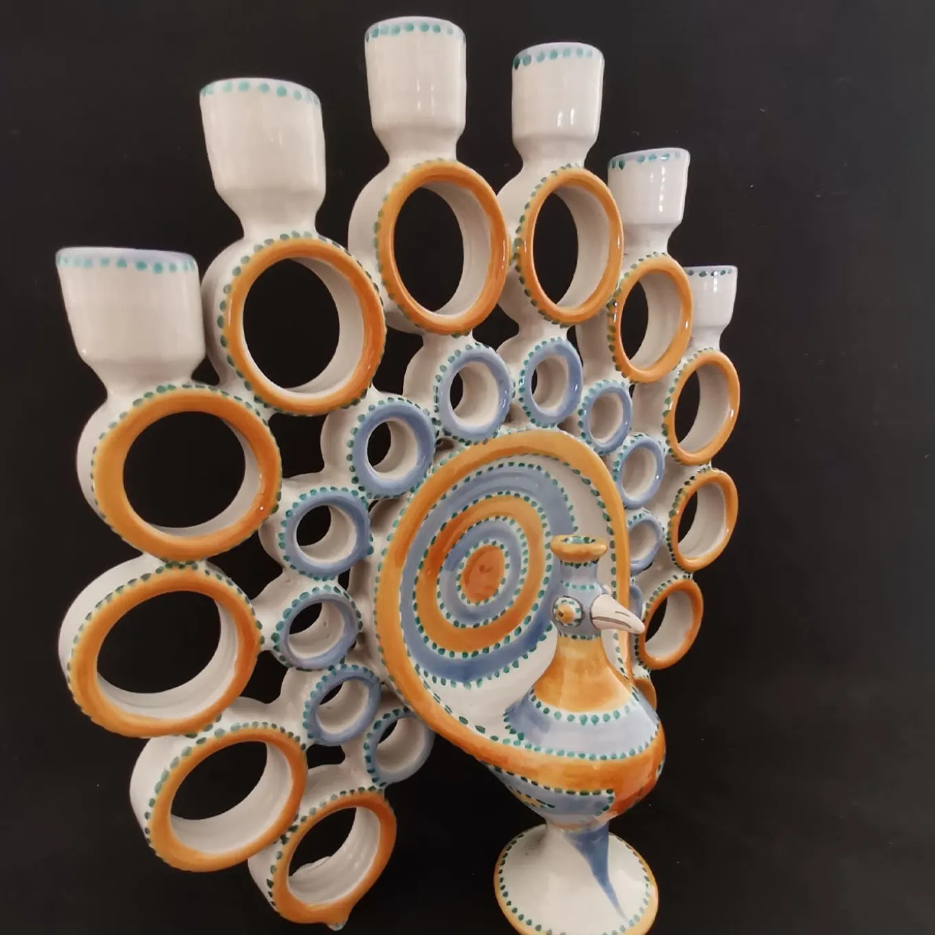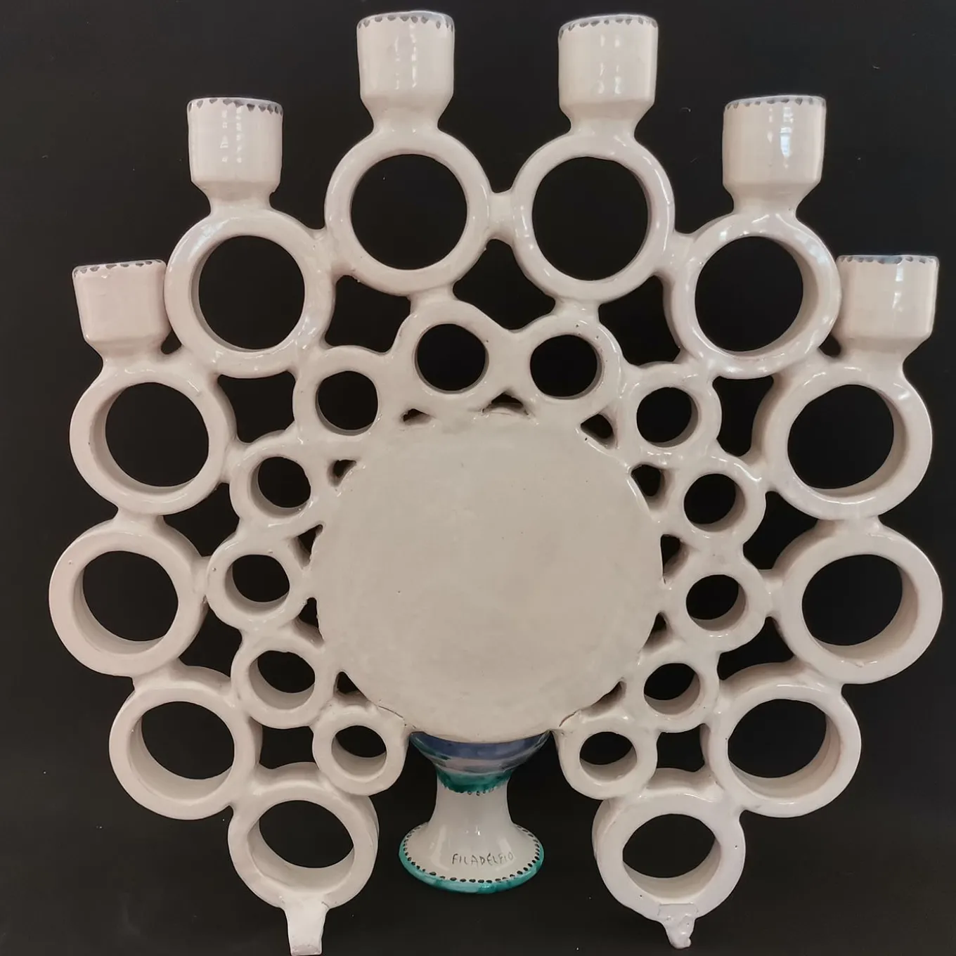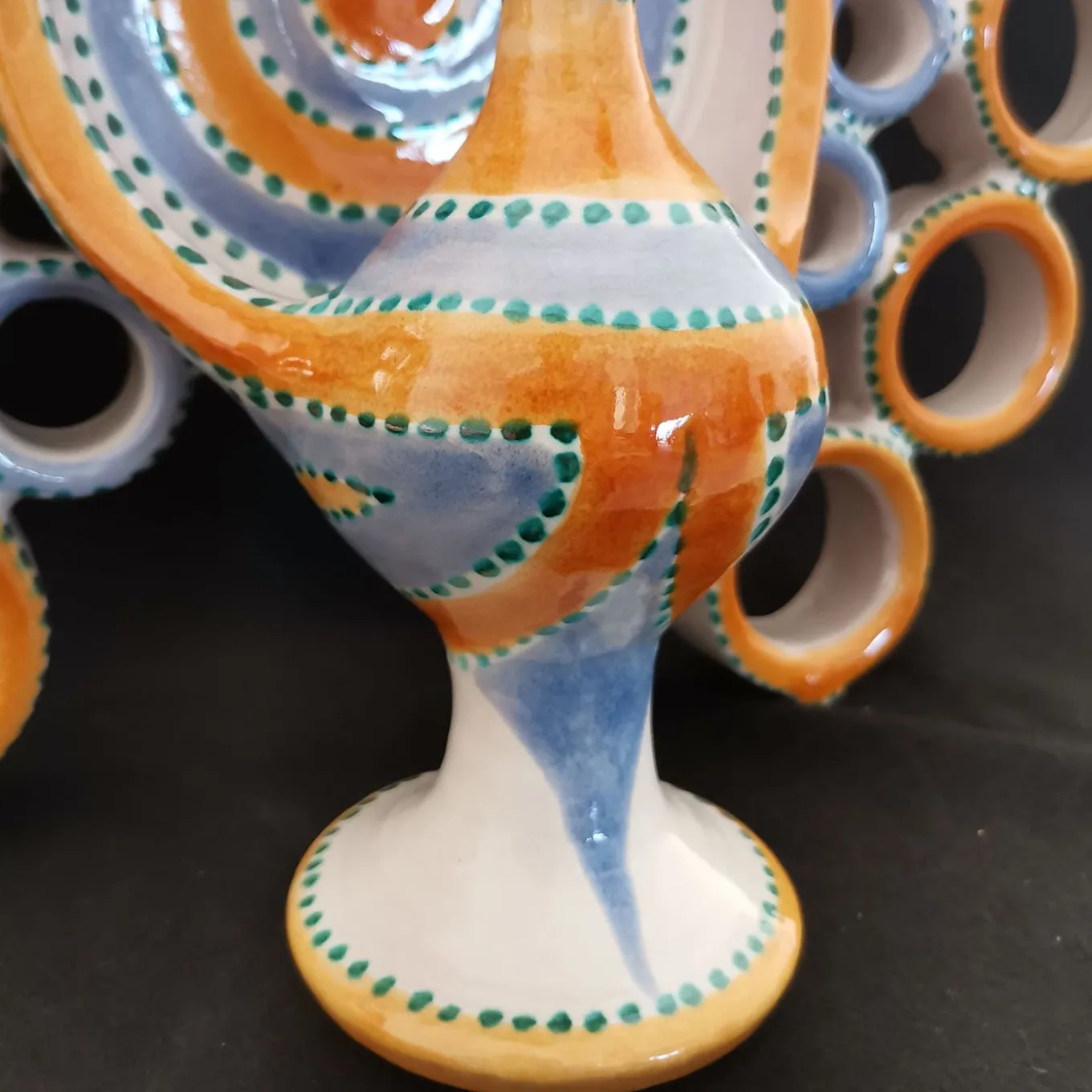 Culminating in six slots where to arrange as many candles, this ceramic candelabra is a true show-stopper with its spectacular peacock-like design. Vivid shades of azure and orange at once enhance its inspiration and workmanship, which can be admired in the triumph of radially arranged rings artfully recreating a peacock’s open tail. Other color options are available in the Artemest catalog.