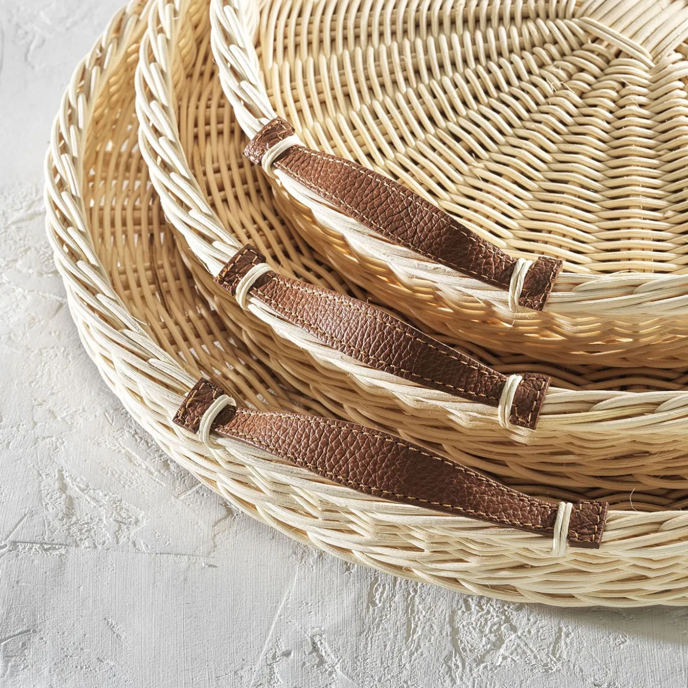 This singular round tray made by hand-weaving reeds in an intricate wicker design couples ancient craftsmanship and fresh minimalism. Equipped with brown leather handles, it features a transparent glass disk laying on the bottom for exceptional steadiness when serving drinks. A special water-based finish allows it to withstand the test of time. Variants measuring Ø 32 x H 5 cm and Ø 38 x H 5 cm are also available, please contact the Concierge.