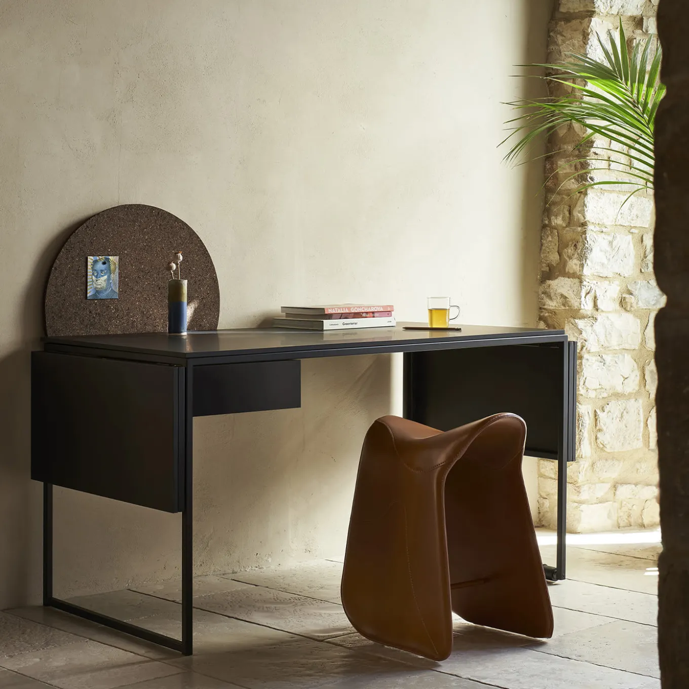 Inspired by horse saddles and luxuriously covered in full-grain brown leather with sinuous stitching details sewn by hand, this iconic stool by Raffaella Mangiarotti will make an eye-catching statement in any sophisticated modern home. The curved steel core is shaped in a sleigh design that allows for a specific inclination favoring the right posture. A version in black leather is also available, please check the Artemest catalog.