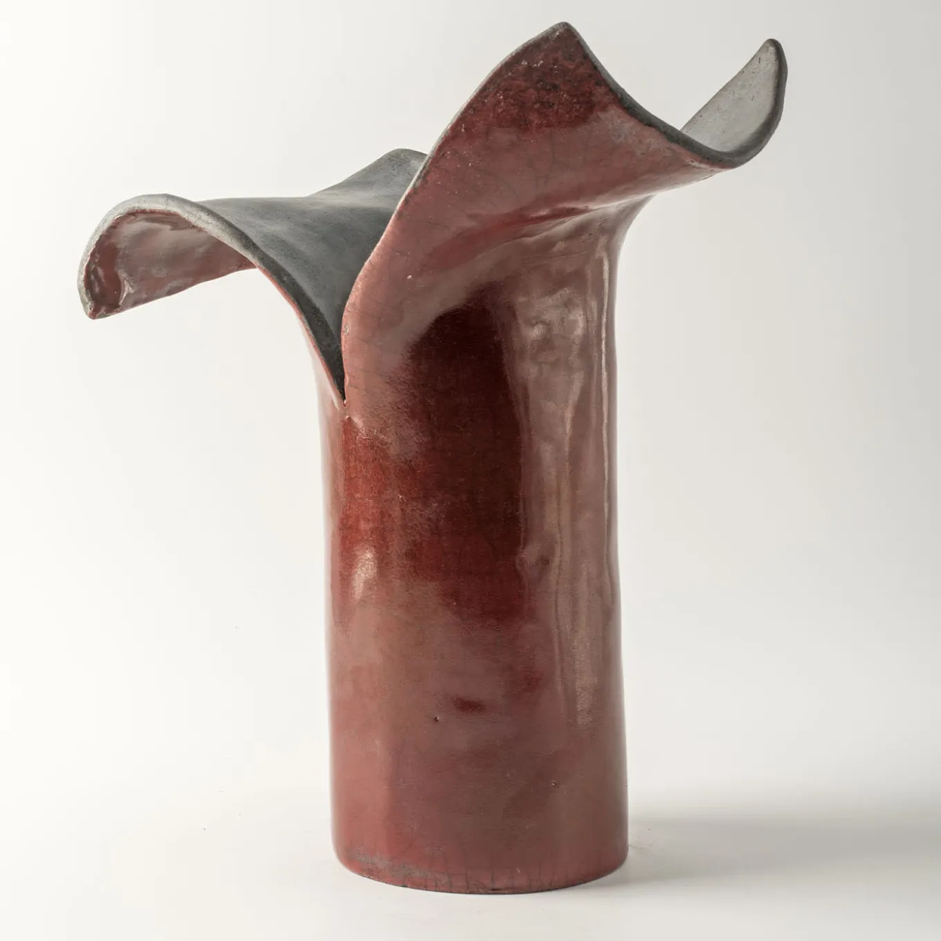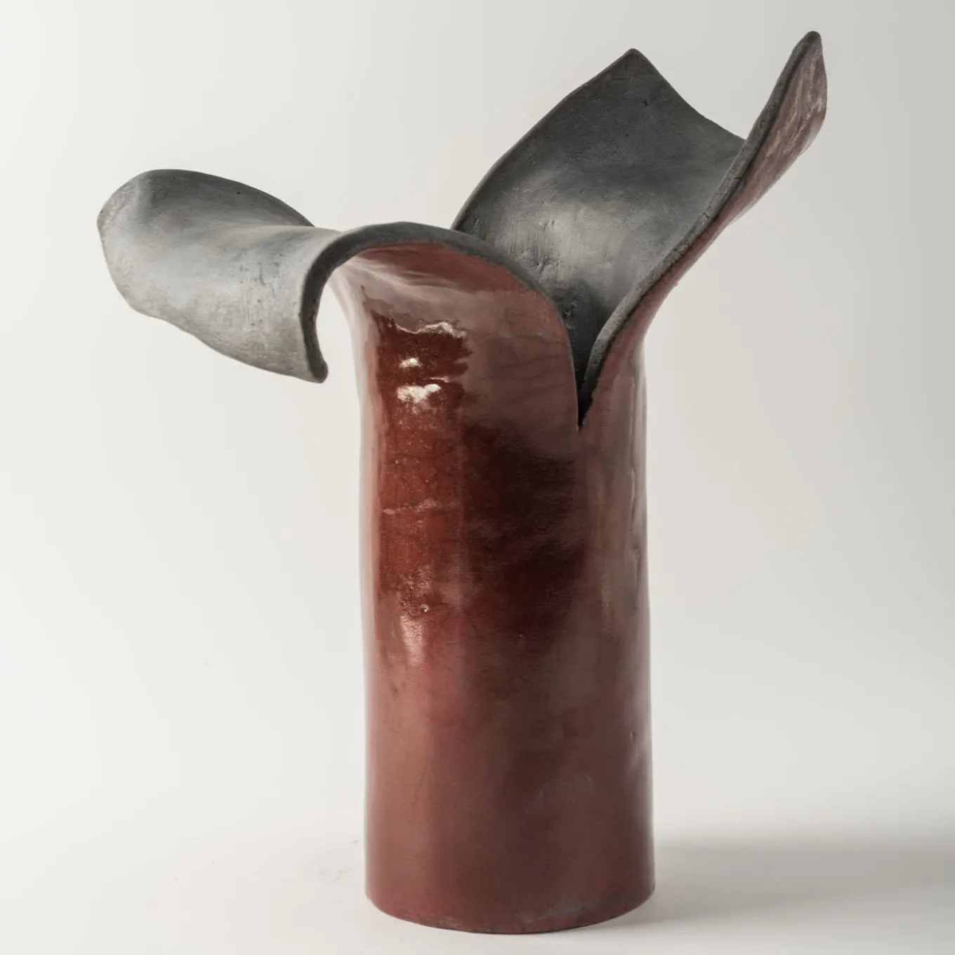 Obtained from the deliberate ripping of a cylindrical ceramic body, two irregular halves curve outwards as petals from their stem in this singular Raku ceramic sculpture. Also suitable as a simple vase for displaying elegant dried floral composition, it flaunts a glossy craquelure amaranth-toned look on the outside, while the interior is offered in a matte graphite-gray finish for a neatly contrasting impact.