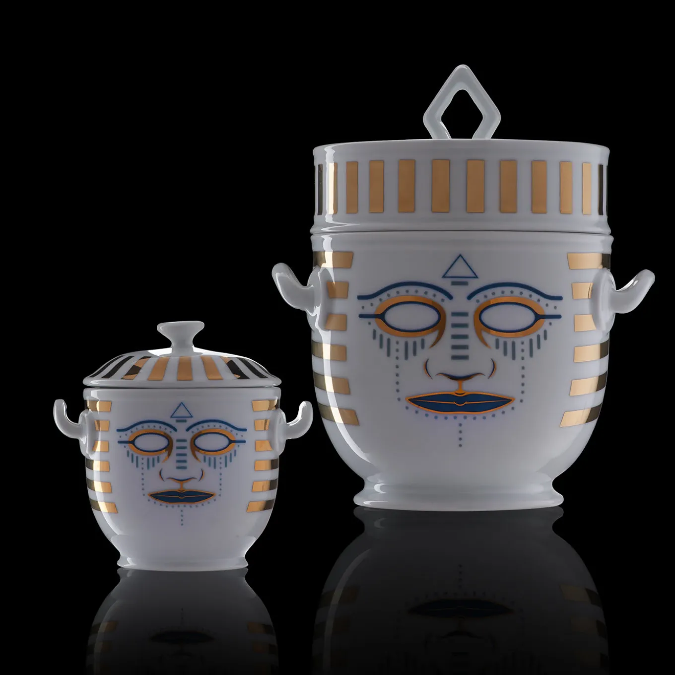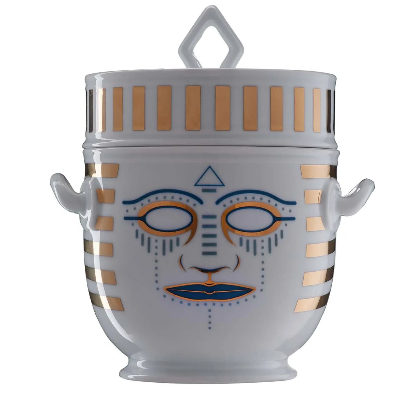 Based on the original “rinfrescatoio” by Geminiano Cozzi intended to keep fruit and other foods fresh on the table, this refined piece is composed by two stacked pieces: a top lid and the actual ice bucket with handles. Part of the collection Ethnics, designed by Gianpiero Mastro, this piece is inspired by the ancient masks of different cultures.