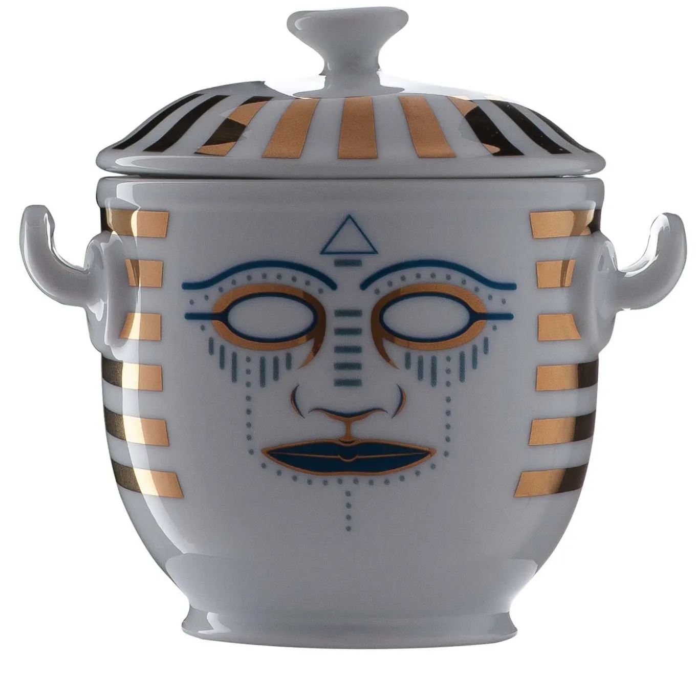 Based on the original “rinfrescatoio” by Geminiano Cozzi intended to keep fruit and other foods fresh on the table, this refined piece is composed by three pieces: bottom, dome-shaped lid and bowl to maintain caviar, fruit, or delicacies at optimal temperature. Part of the collection Ethnics, designed by Gianpiero Mastro, this piece is inspired by the ancient masks of different cultures. Behind it there is a careful research of colours and stylistic elements, according to the canons of Geminiano Cozzi who creates a marriage between the ancient Venetian tradition of porcelain and the cultures of this increasingly global world accompanying the “rinfrescatoio” in a path that transforms it into an object of cult and collection.