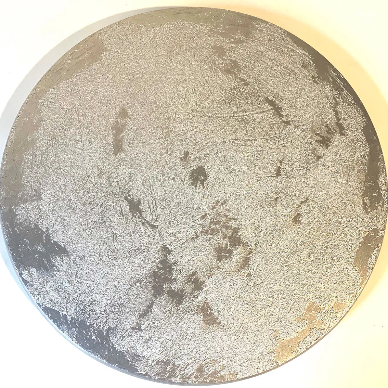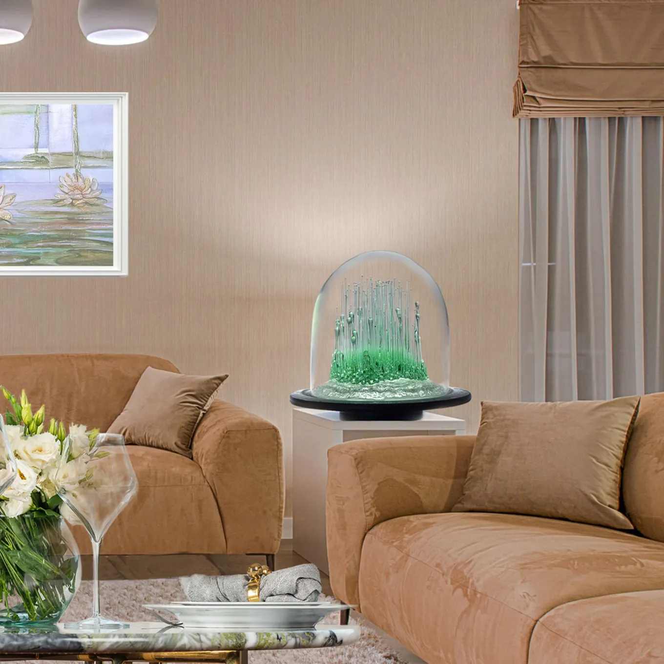 Encased in a bell jar crafted of clear blown glass, turquoise filaments in Murano glass seemingly defy gravity to create this miniature green planet, the ground made of molten glass enriched with fluorescent pigments. A utopian scenario recalling “Invisible Cities” by Italo Calvino, the sculpture rests on a footed, swivel wooden support that is coated with a micro-cement, textured resin flaunting a silvery finish.