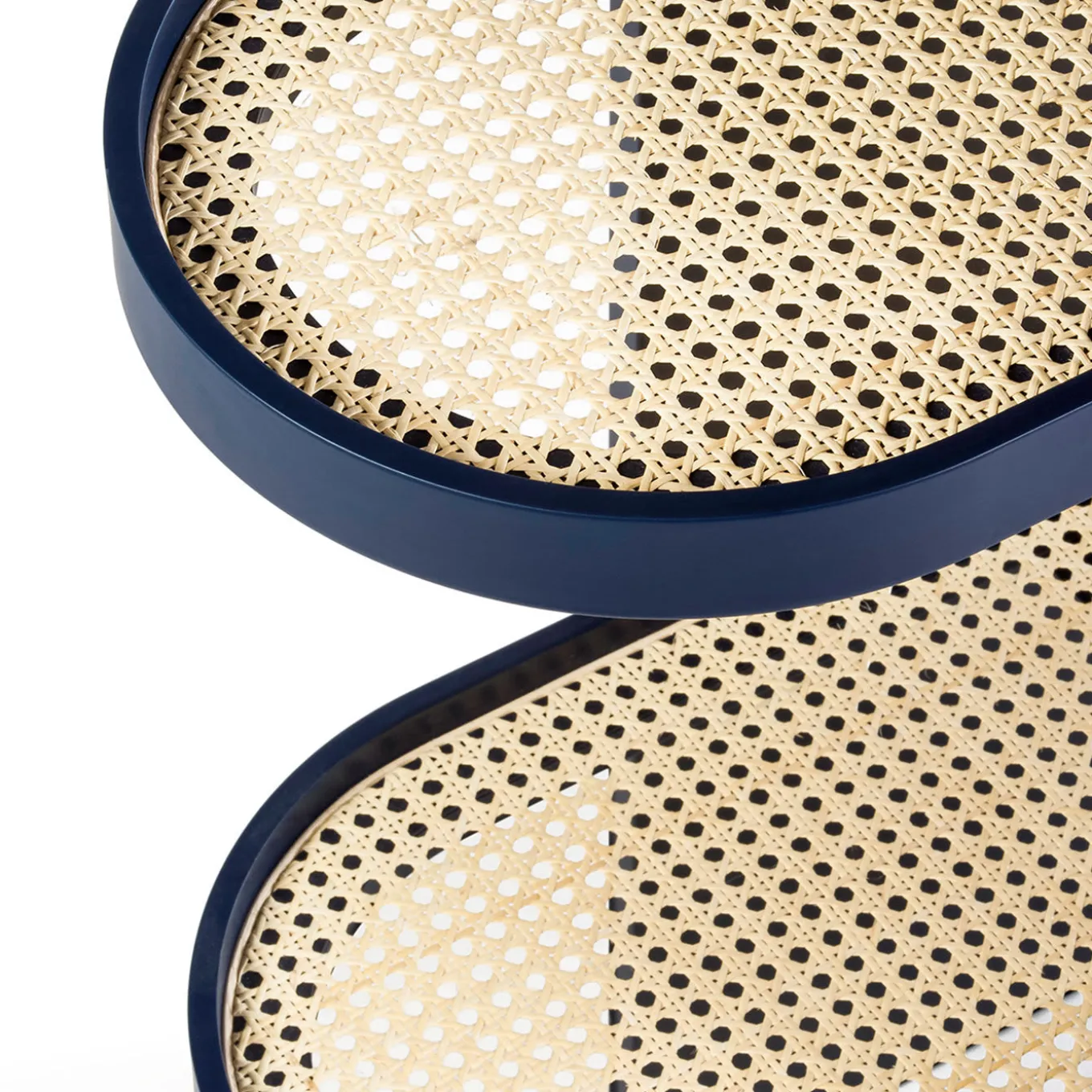 Structural balance and visual harmony make this stylish bookshelf a functional art piece that will complete a living room or office decor with modern elegance. Crafted of wood finished with an iridescent steel blue lacquer, this piece features three oval shelves suspended between two imposing rectangular side panels and covered with a natural cane surface. This bookshelf is made to order, please contact the Concierge for details.