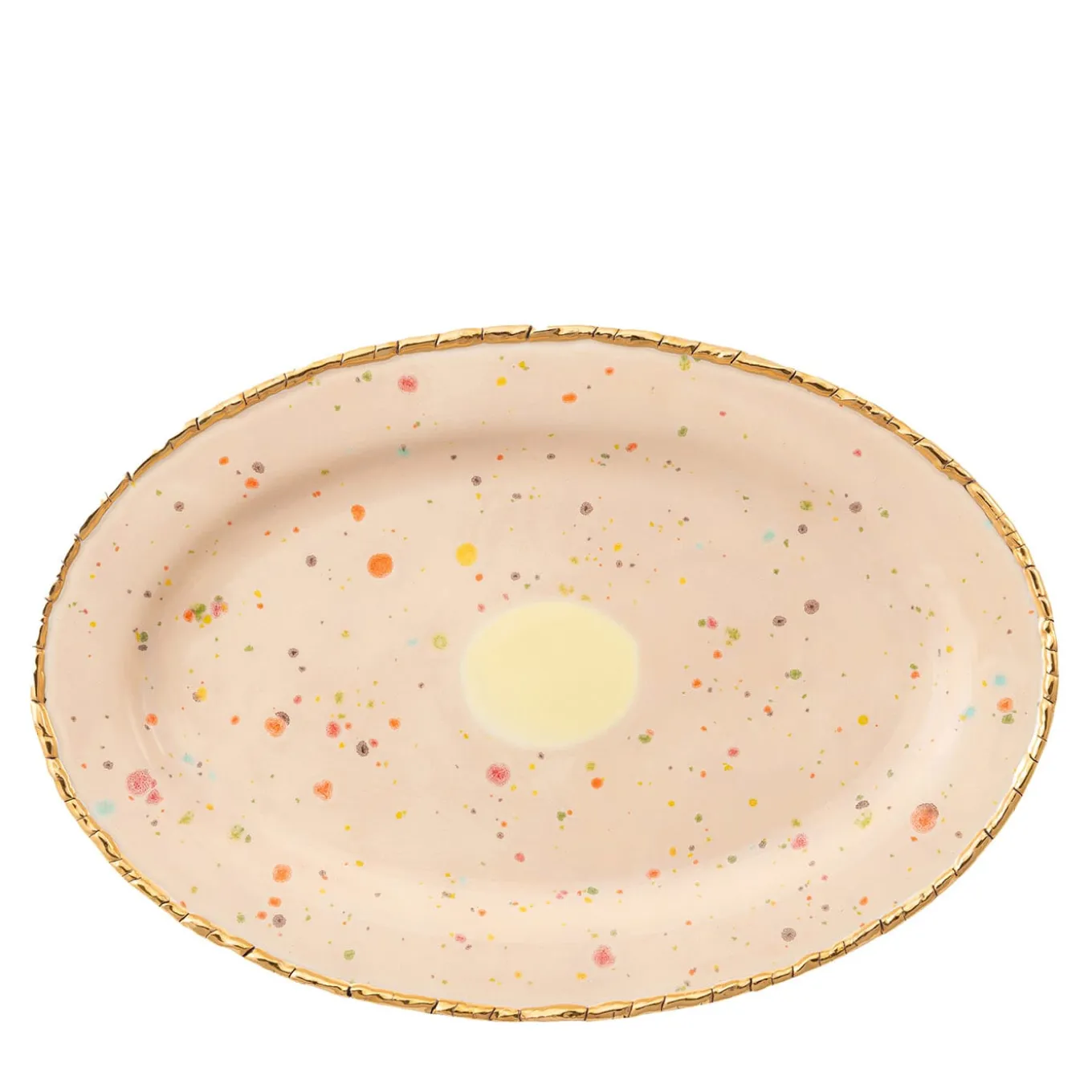 The Piazza del Popolo collection is named after a Roman landmark, and inspired by traditional Italian artisanal pottery yet decorated in a personal and elegant key. Handcrafted from the finest porcelain, this Chestnut Oval Rim Platter has an original golden craquelé edge emphasizing the warm sandy surface, the multicolor dots, and the bright yellow center. Due to the presence of real 24-karat gold, it is not suitable for microwaves. Non-aggressive soap and delicate washing are recommended.