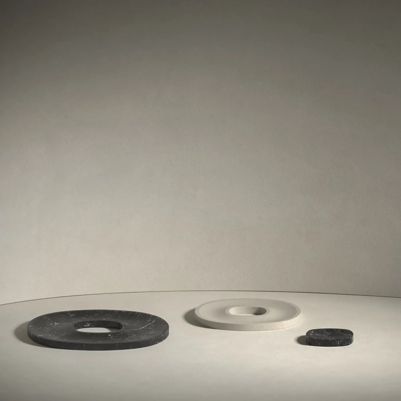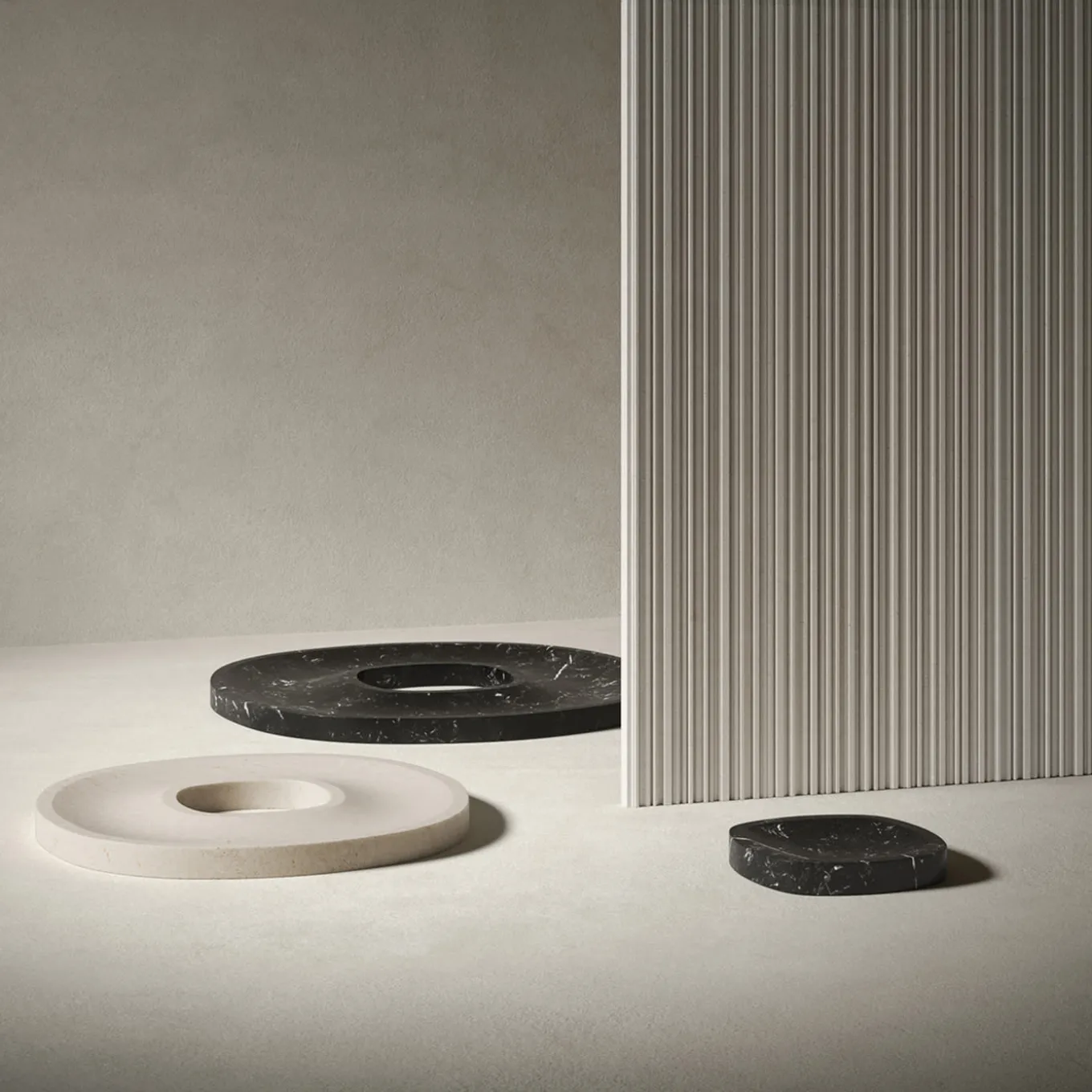 Harmonious and welcoming, the ring-like design (Ø 30cm) of this tray makes it an elegant and artful solution for collecting fruit or serving canapés on special occasions. Its silhouette is crafted of Crema d’Orcia, a bright, cream-toned limestone characterized by delicate veins that unpredictably vary from piece to piece. A larger variant in black Marquina marble is also available, please check the Artemest catalog.