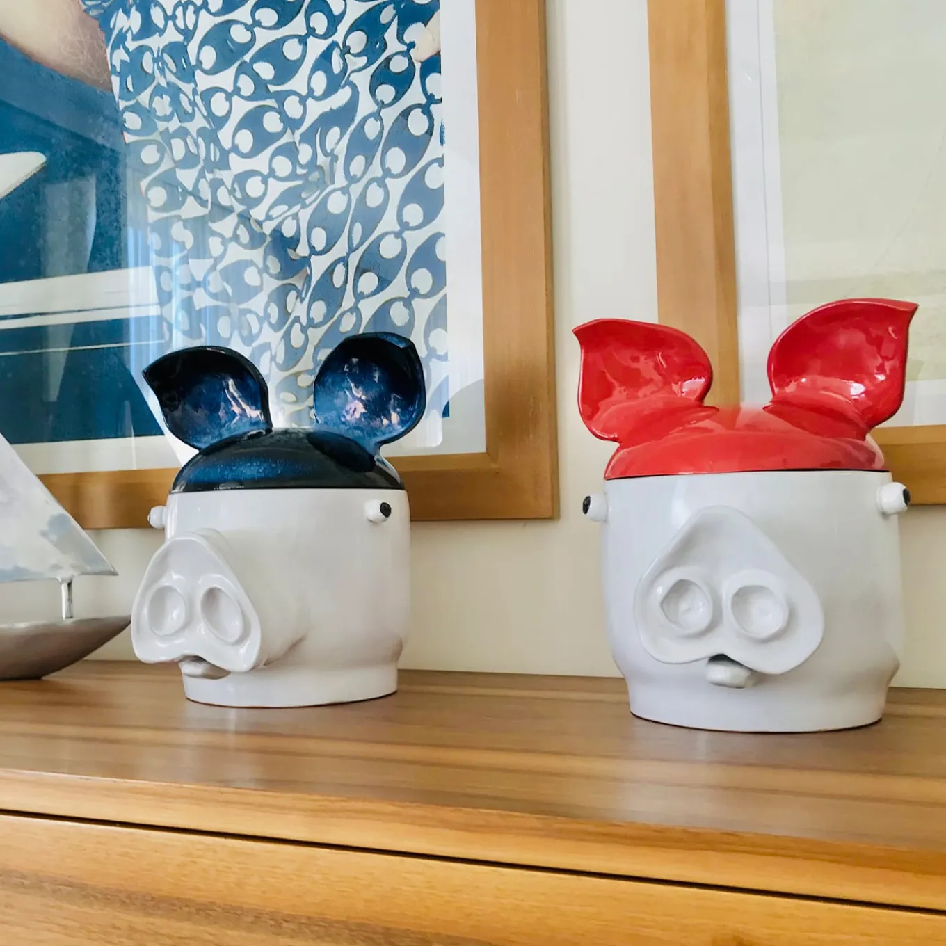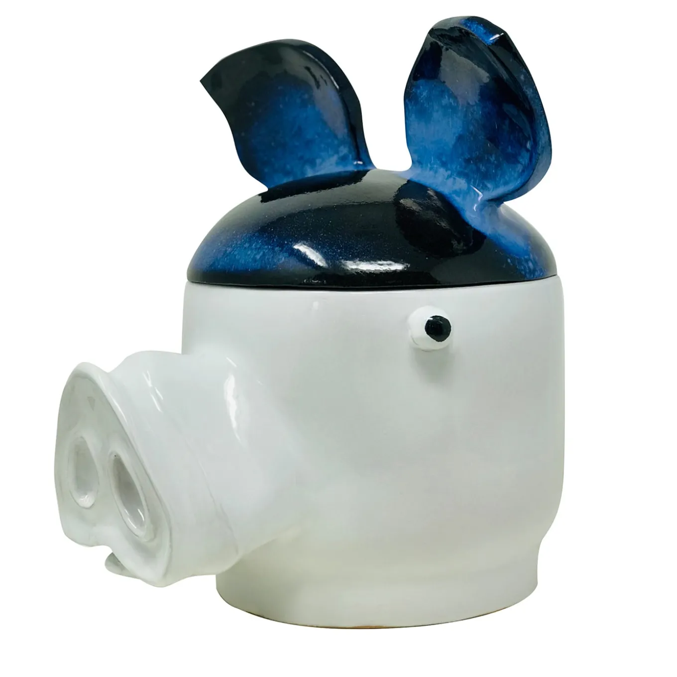 A piece of functional decor with a distinct eccentric character, this ceramic design ironically shaped like a pig’s head will serve as an original container for bon-bons and cookies. Entirely shaped by hand with the traditional coiling technique, it gets fired first at 960° to transform the clay in terracotta, and then at 930° to seal the bright white and blue glazes accenting the base and lid, respectively. Please ask the Concierge for color customizations and pricing of the small variant.