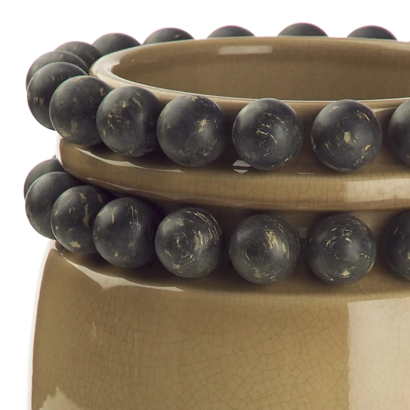 This striking piece of functional decor can be displayed alone or combined with the other Pike pieces, for a cohesive look. It was crafted entirely of ceramic with a crackle glaze finish on the sienna-colored surface. The delicate curves of its silhouette are adorned at the mouth with two rows of dark brown spheres that create a dynamic texture and unique decoration. Different colors are available. Please consult the concierge.