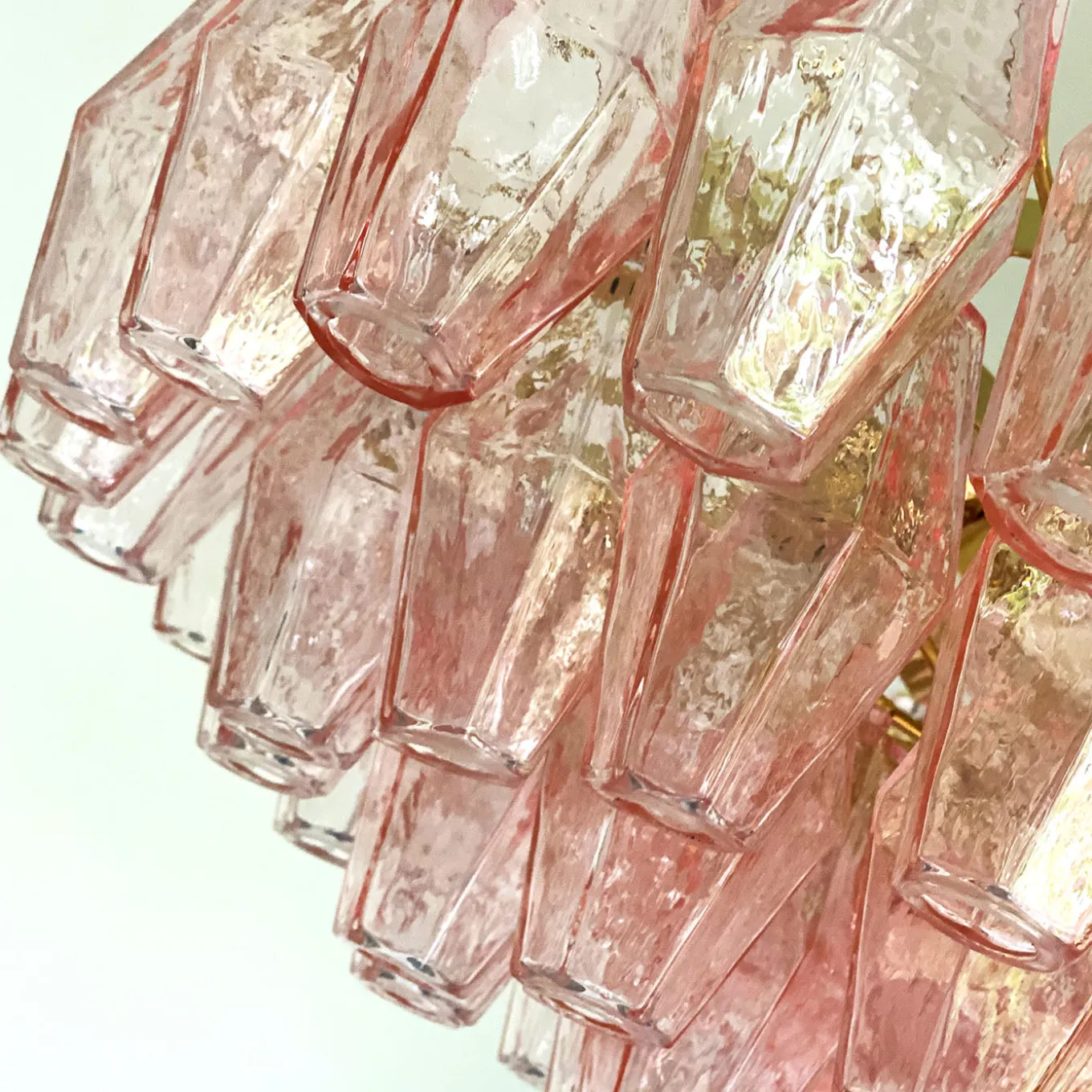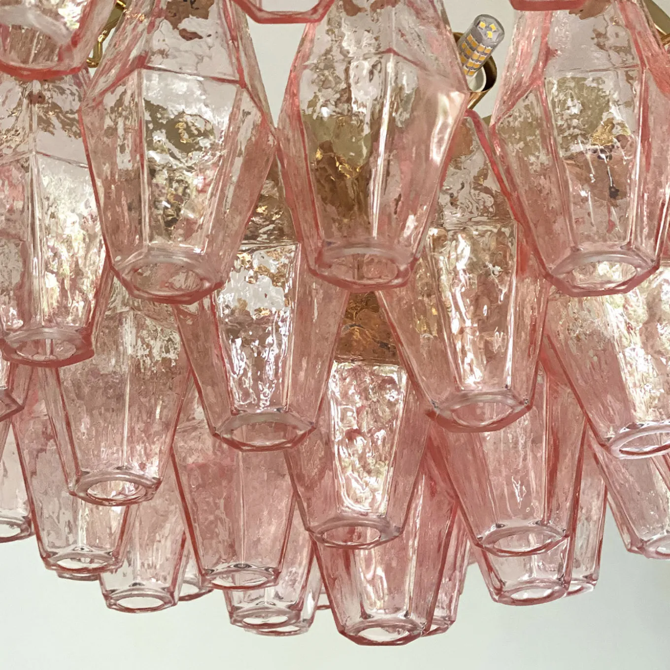 This chandelier features six lights, is designed with polished pink Murano glass elements shaped into distinctive poliedri forms. The structure is supported by a 24K gold-plated metal frame with an adjustable chain and canopy included. Suitable for classical and contemporary interiors, it requires compatible LED bulbs for sustainable illumination. UL certification available upon request. Bulbs are not included.
