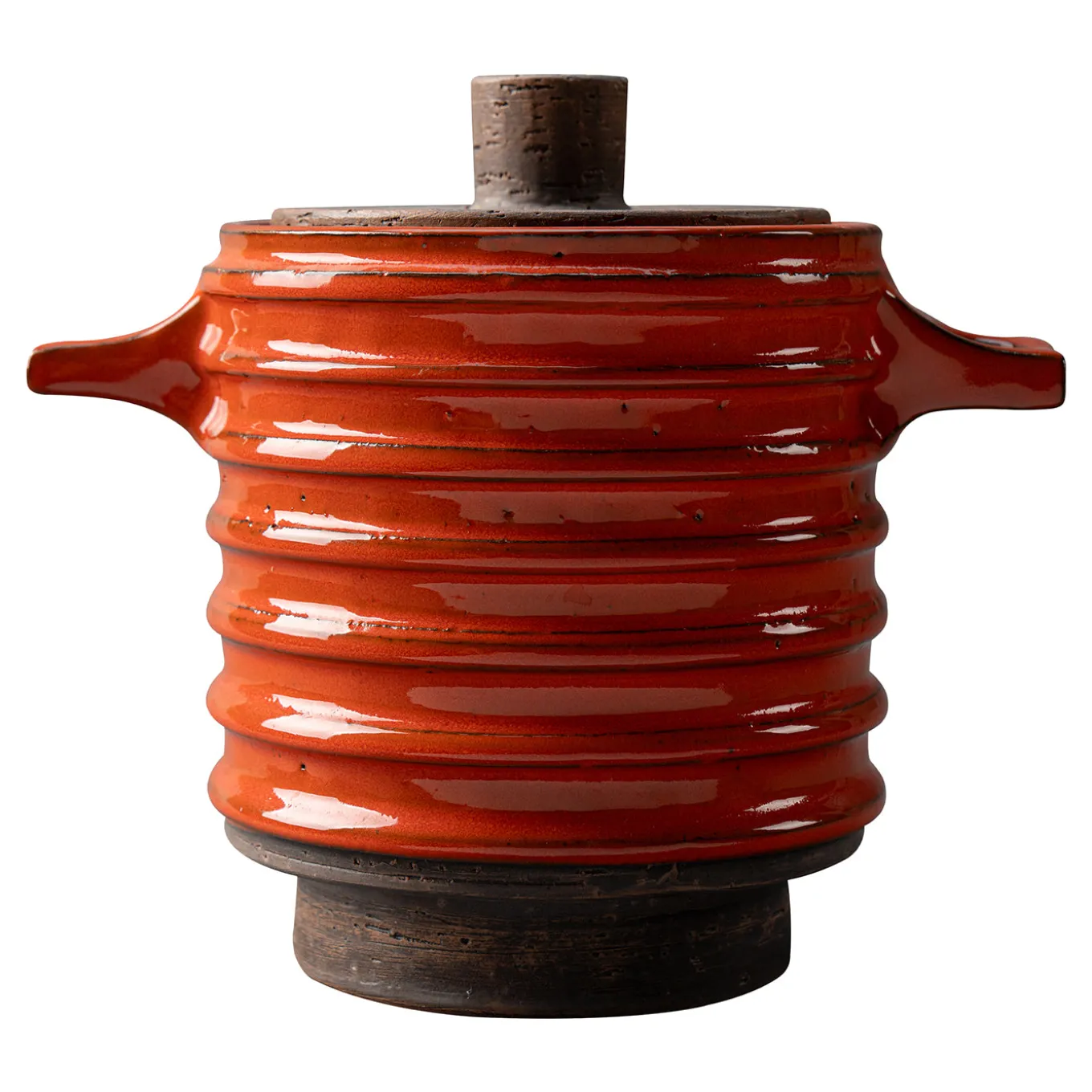 Pipe holder box featuring a lid and small lateral handles designed to hold a pipe securely. The surface is horizontally incised and coated with a bright orange glaze over a brown base, creating a vivid contrast. This limited edition piece from the 2008 reissue archive consists of 199 numbered copies, combining functional design with artistic expression.
