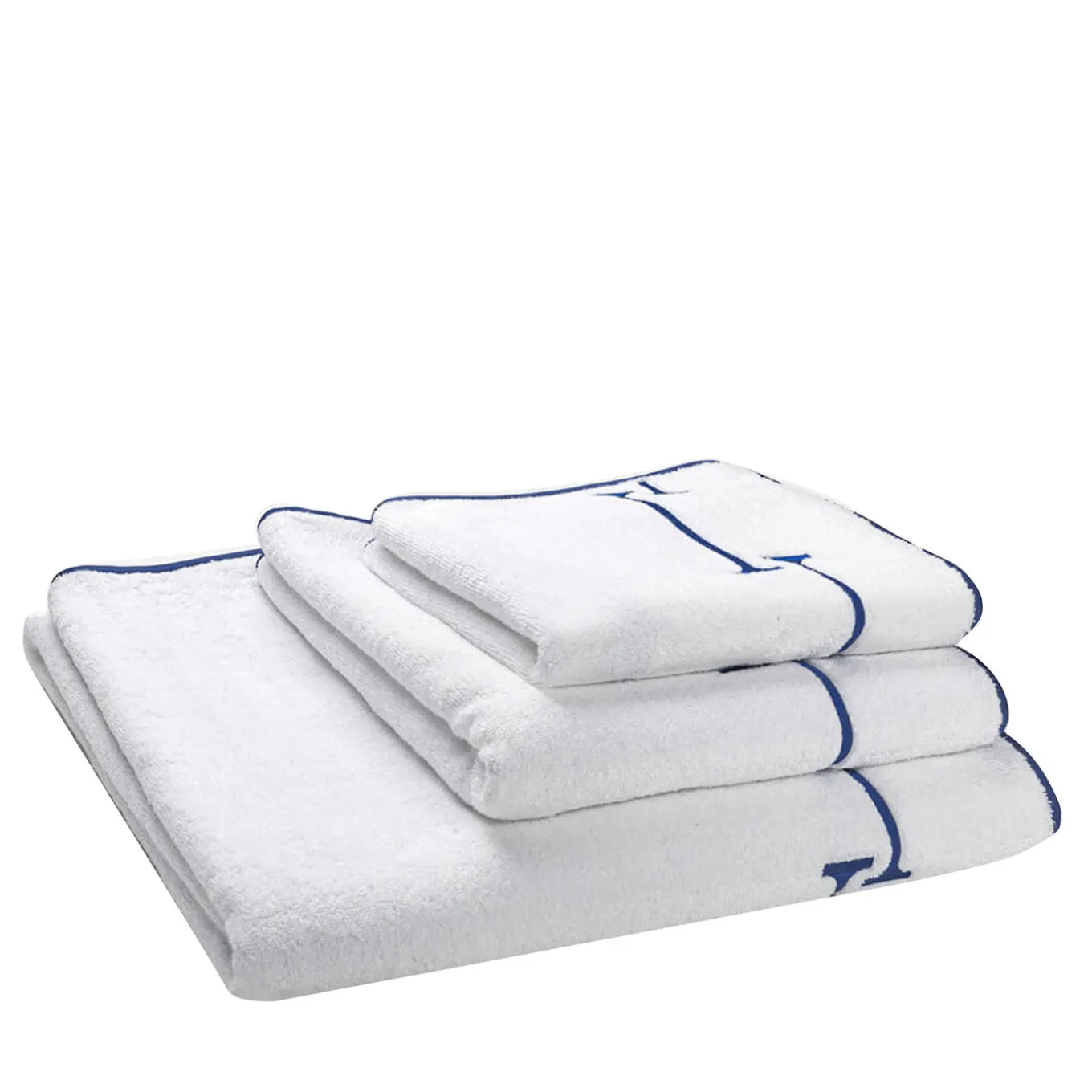Set of three towels including a bath towel (110×150 cm), a hand towel (60×100 cm), and a guest towel (40×60 cm). Each towel features a distinctive blue bias edging and elegant embroidery on one short side, adding a refined touch to the classic white fabric. Designed for both functionality and style, this collection offers softness and absorbency suited for daily use in any bathroom setting.