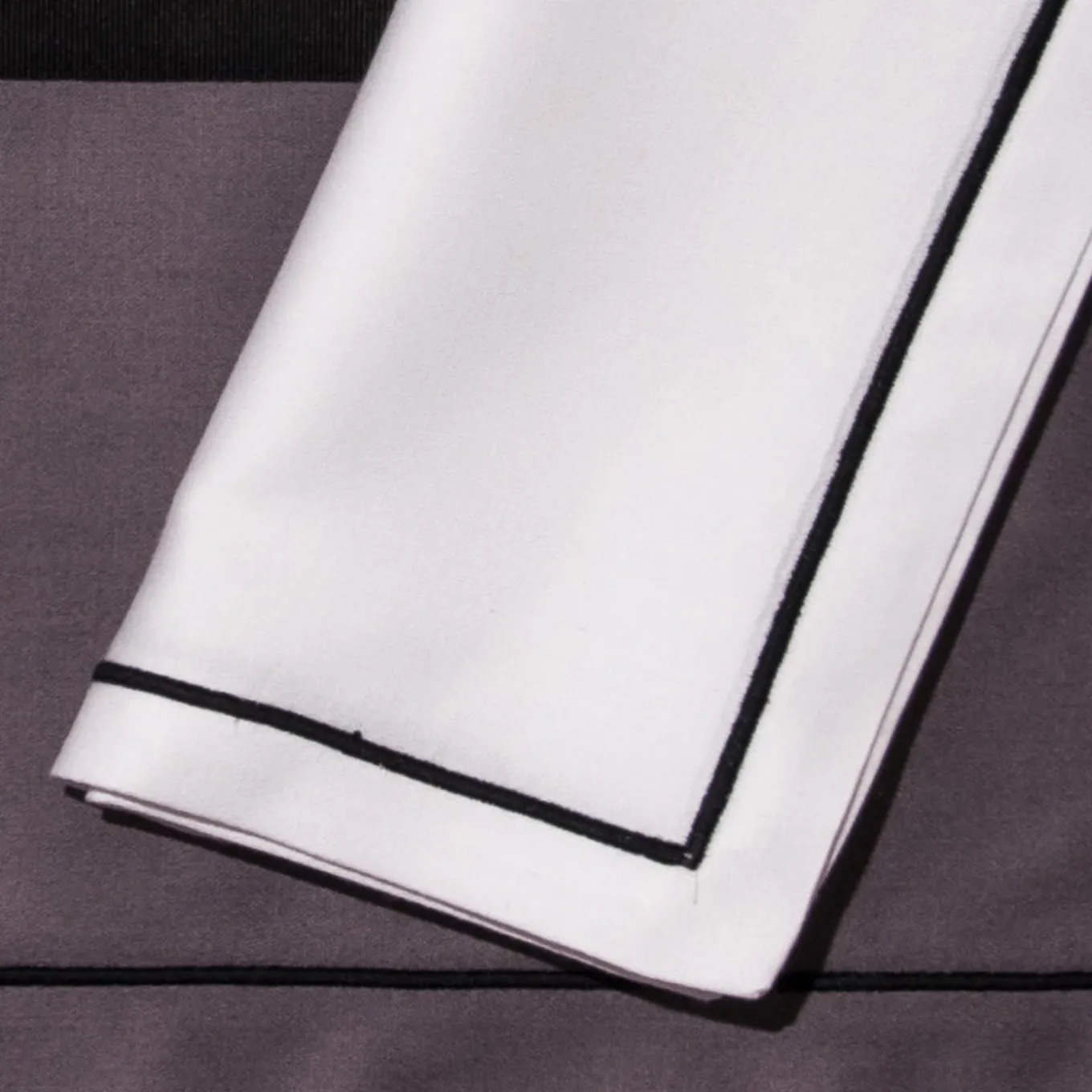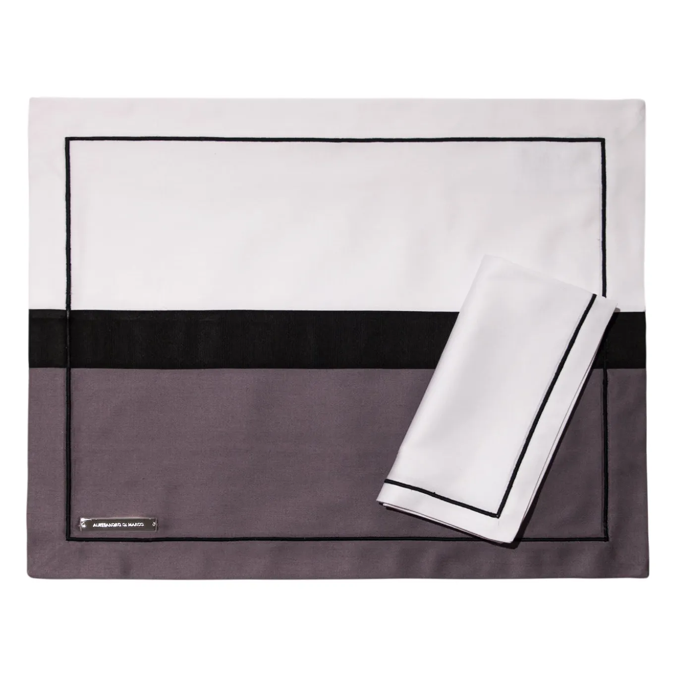 This delightful place setting includes two fine cotton two-toned placemats in White with Gray, accented by a black satin ribbon, and a thick black frame. Two attractive napkins accompany the set in White cotton with Black embroidery and a satin finish. Metal logo plate has been embossed and sports a Palladium finish.