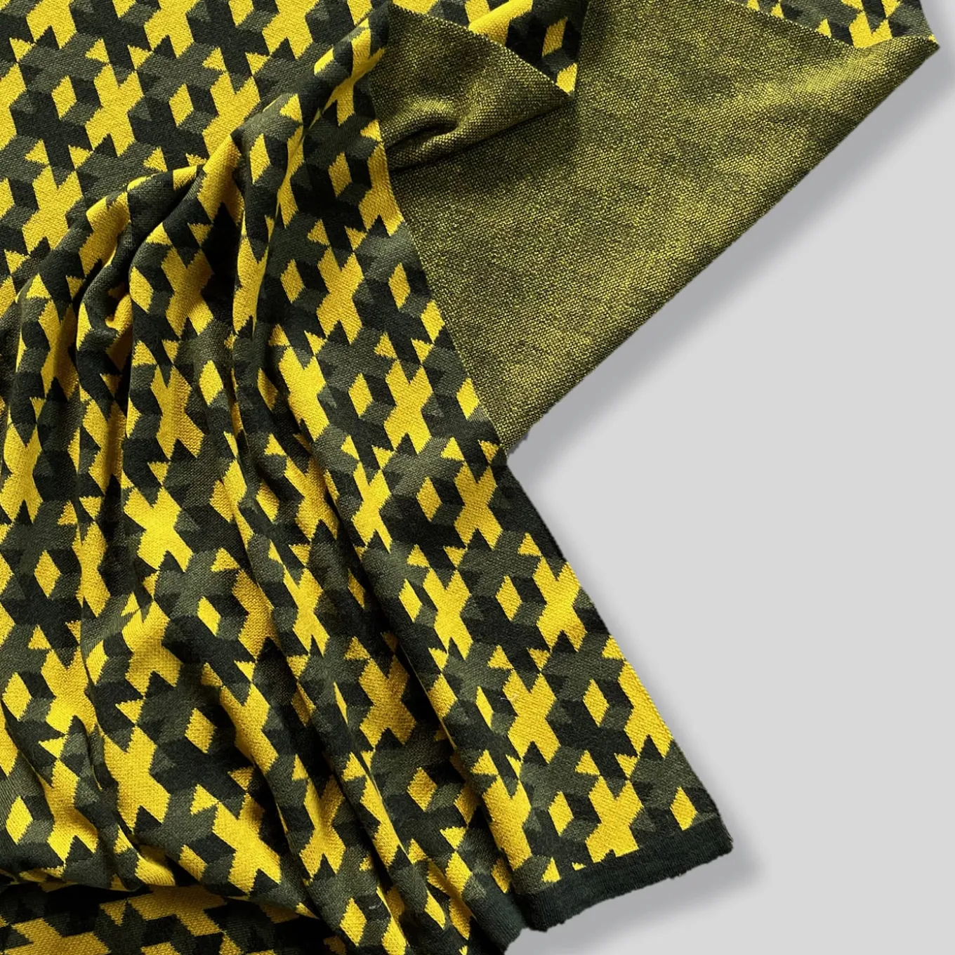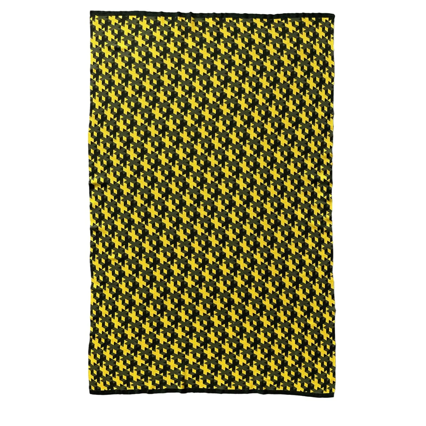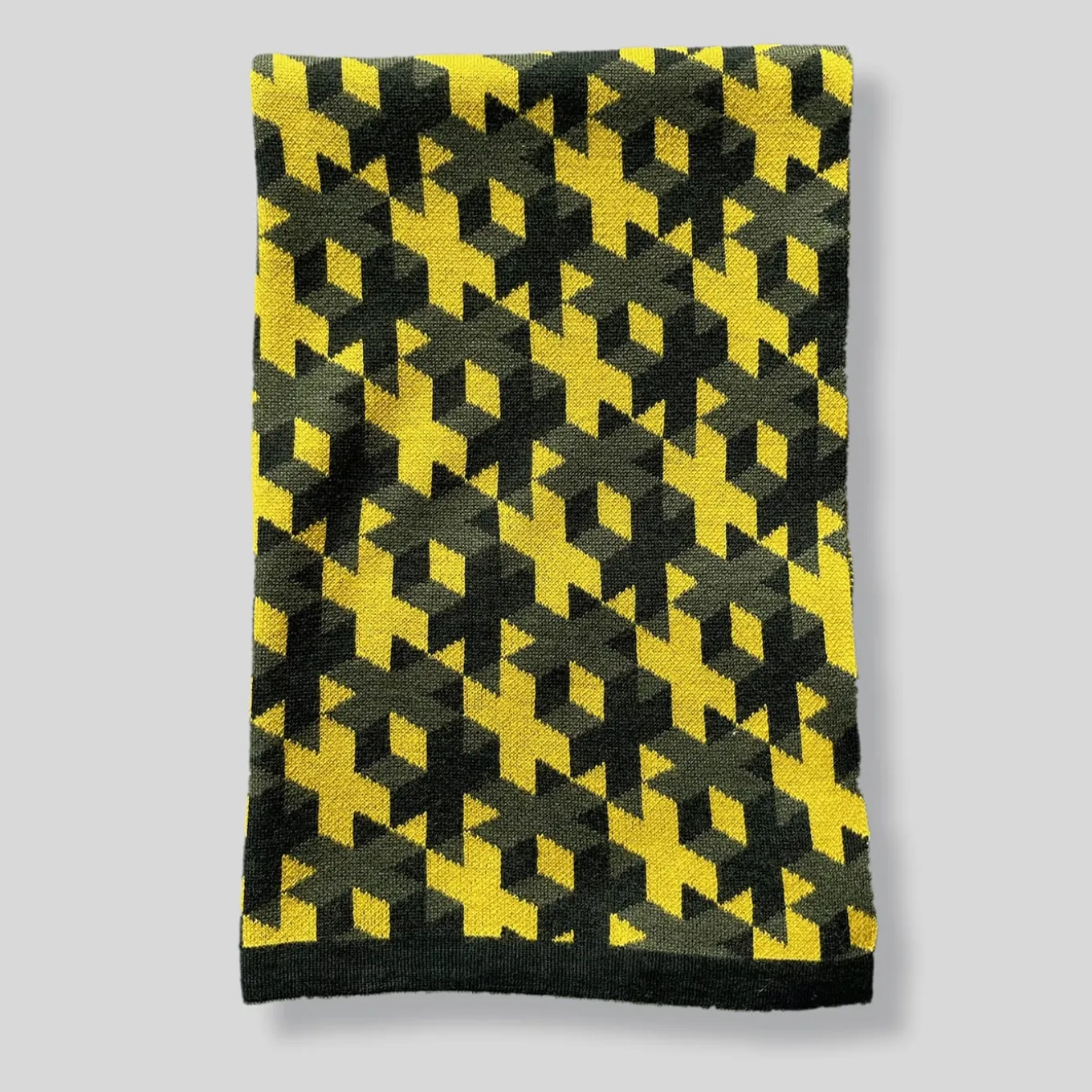 The Greek cross of the tiny Byzantine church of Cattolica di Stilo in Calabria inspired the striking yellow pattern characterizing this precious Merino wool blanket. Woven in a sophisticated jacquard piqué weft, it comes in a vibrant yellow tone that stands against a deep-dark backdrop to underline the sharp contrast.