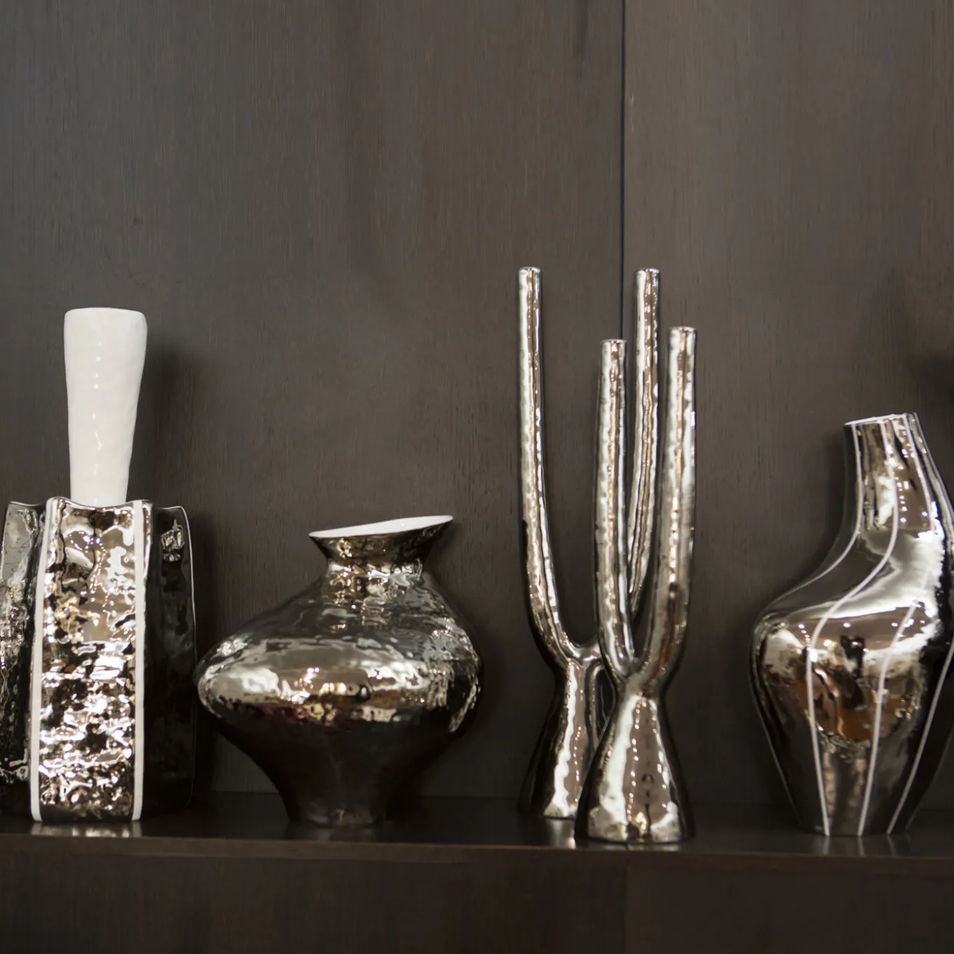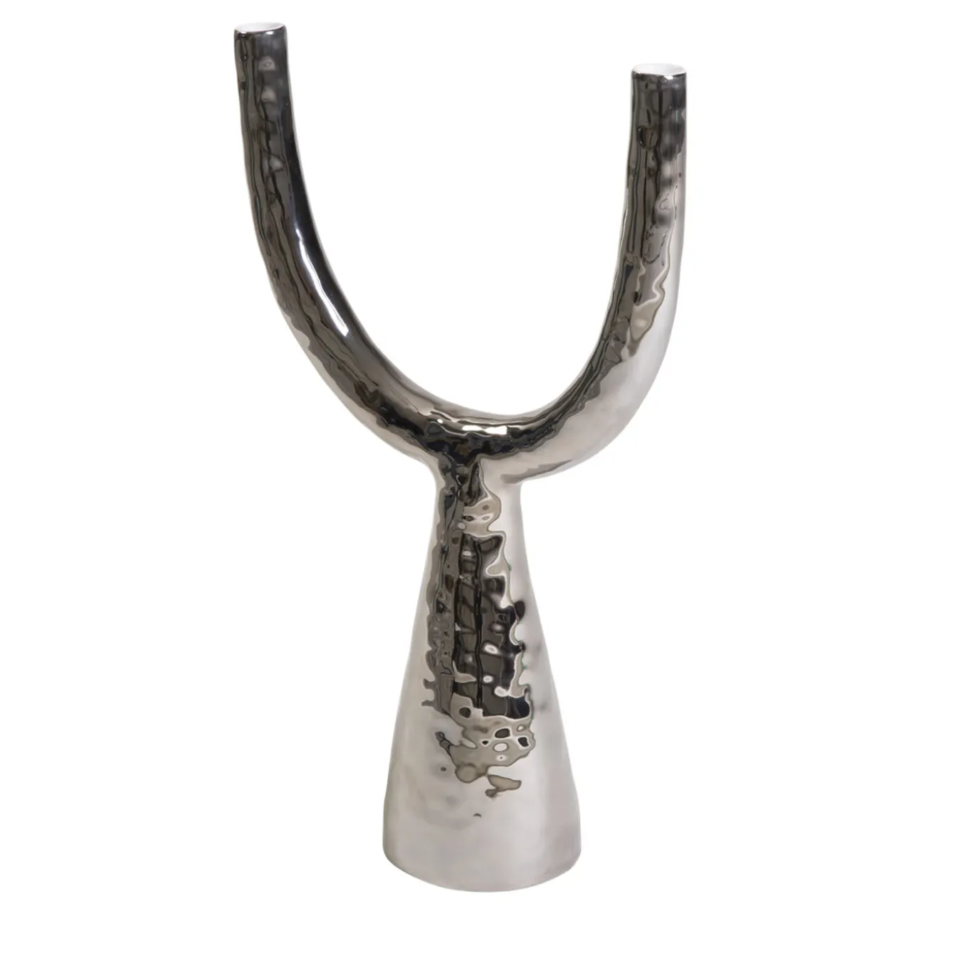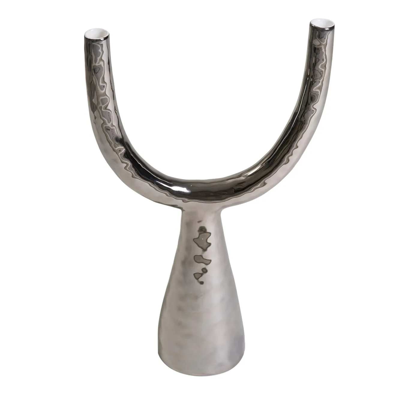 This double candle holder is a classy, modern décor piece by Gatti Ceramica. After the first firing, the maiolica original is hand-painted and then fired for the second time. The piece is finished with pure platinum and a third firing, in accordance with the time-honored techniques of Faenza, the ceramics capital in Northern-Italy.