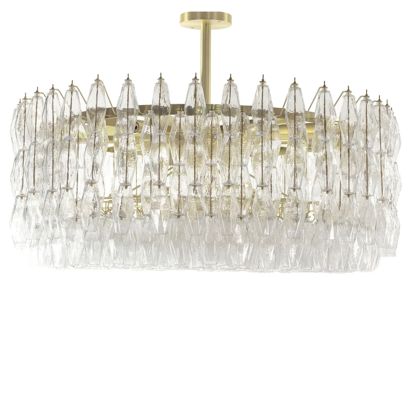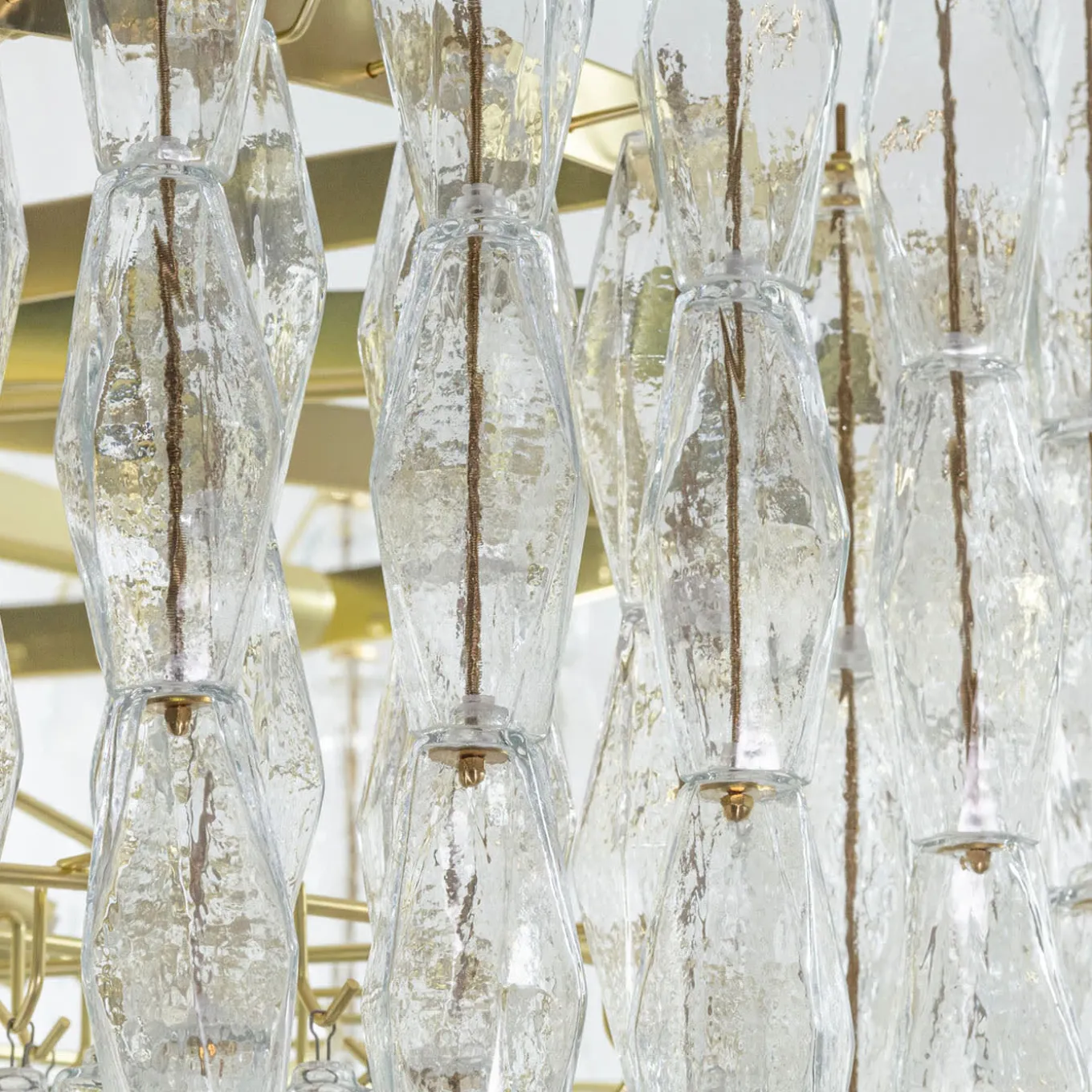 Deco-style chandelier with polyhedral crystal glass, handmade in Venice in the artistic glassworks Bottega Veneziana. Brushed brass finish. The polyhedrons can be used to create modular structures of different shapes and sizes. Glass colour and metal finish can be customised. Please ask the Concierge for other informations.