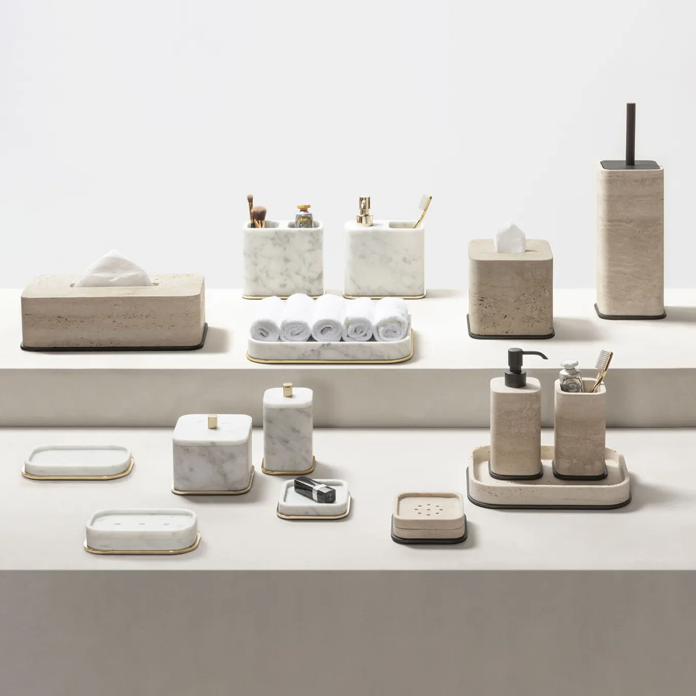 The Polo marble bathroom collection features the iconic silhouette with rounded corners, which is characteristic of the Polo family of creations, one of the brand’s cornerstones, adding a gentle touch to each piece while denoting a taste for the minimal and the geometric. Every stone used to bring a Polo marble set to life is different from the other, providing a unique, exclusive design to each creation. Different marble and metal finishes are available upon request.