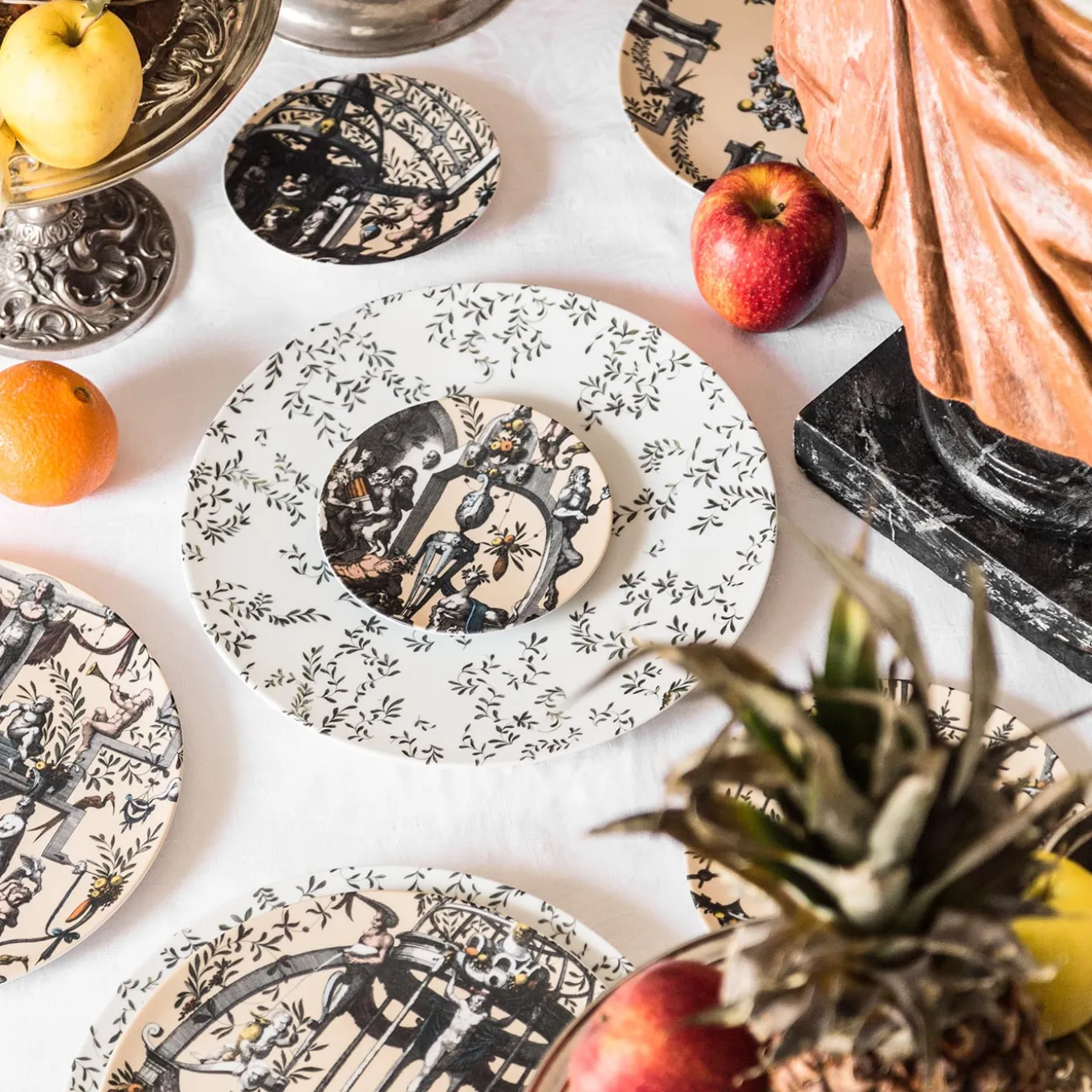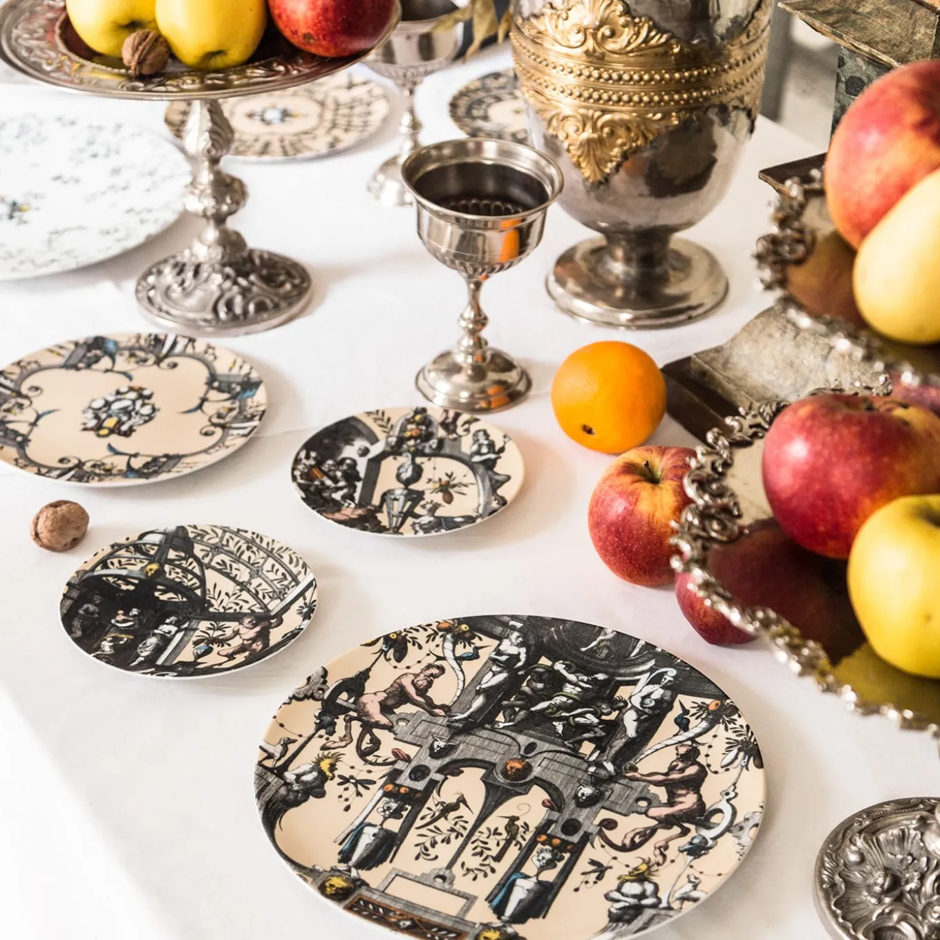The new Pompei porcelain collection brings back the Grottesche wall decoration in a contemporary key. Ancient designs are taken and declined on the different formats of the mise en place in such a way as to create elegant and unique plays of overlapping. Natural elements, anthropomorphic figures, jewelry and architecture come together to create stories, decorations and geometries. This collection manages to be transversal, adapting to both regal and elegant tables and more formal settings.