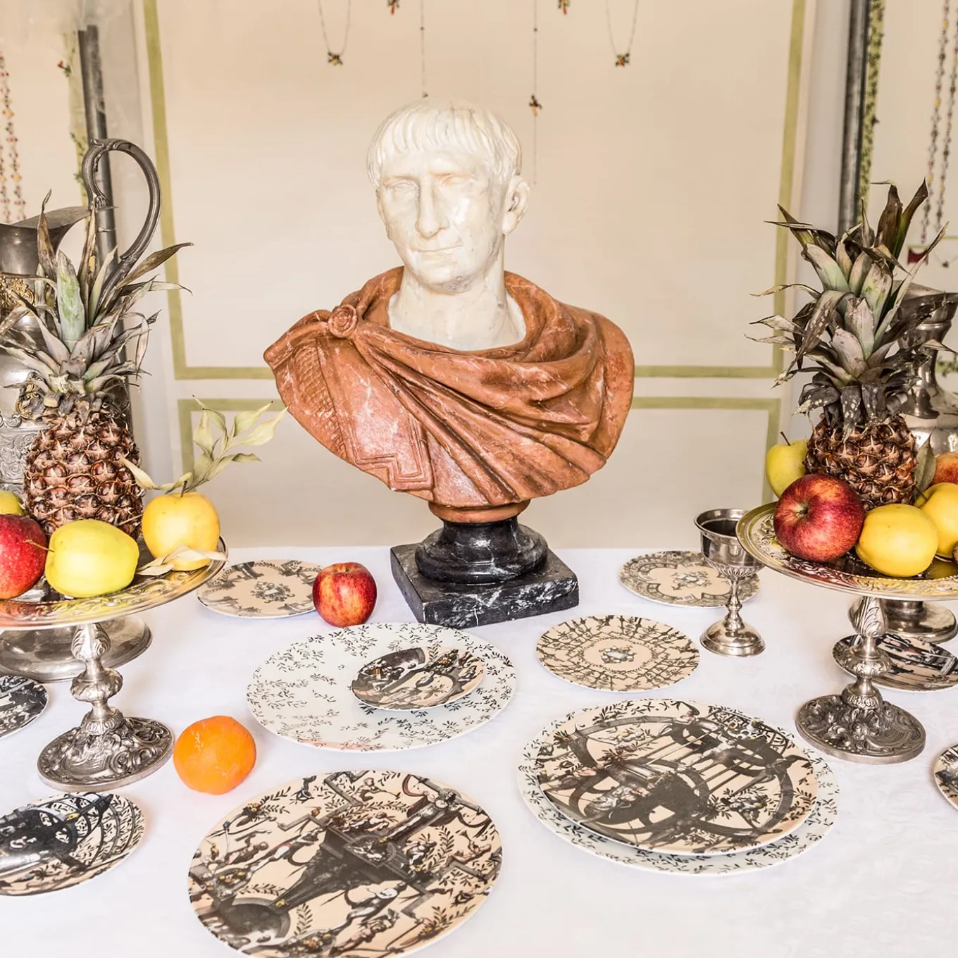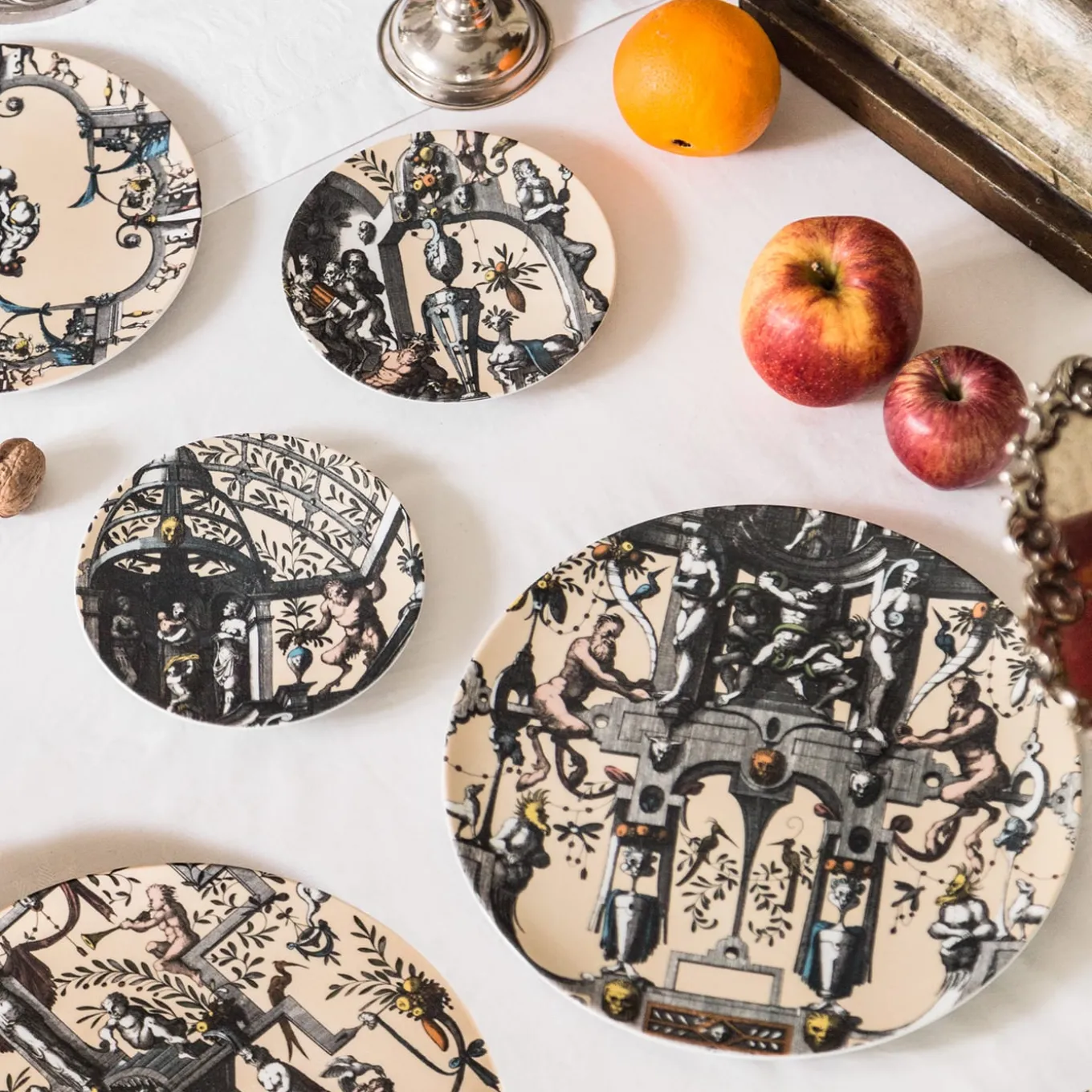 The new Pompei porcelain collection brings back the Grottesche wall decoration in a contemporary key. Ancient designs are taken and declined on the different formats of the mise en place in such a way as to create elegant and unique plays of overlapping. Natural elements, anthropomorphic figures, jewelry and architecture come together to create stories, decorations and geometries. This collection manages to be transversal, adapting to both regal and elegant tables and more formal settings.