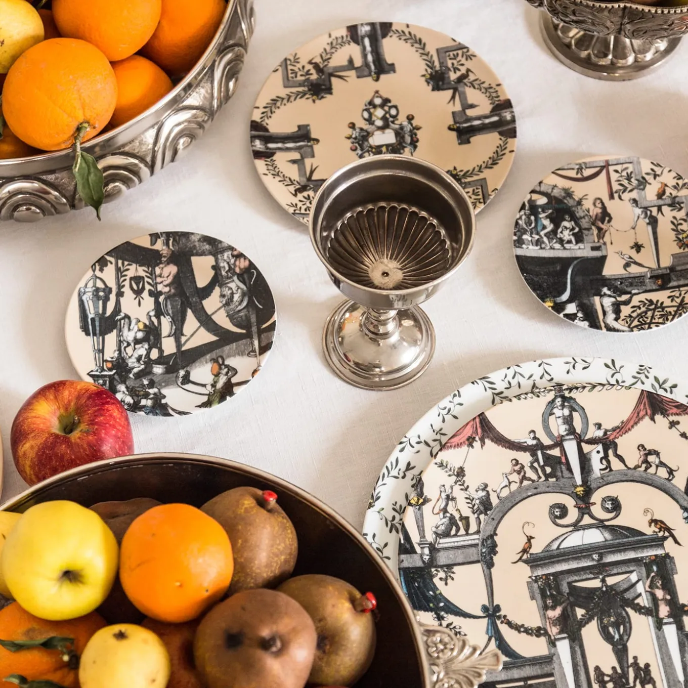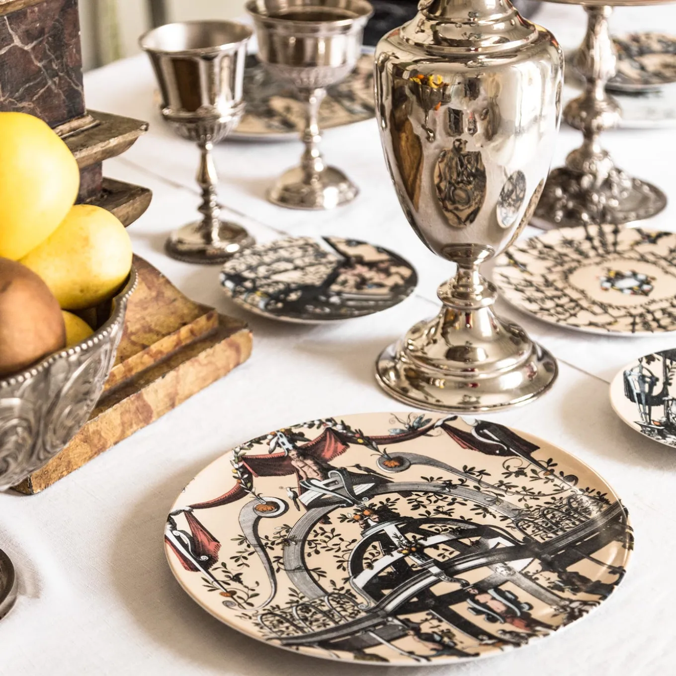The new Pompei porcelain collection brings back the Grottesche wall decoration in a contemporary key. Ancient designs are taken and declined on the different formats of the mise en place in such a way as to create elegant and unique plays of overlapping. Natural elements, anthropomorphic figures, jewelry and architecture come together to create stories, decorations and geometries. This collection manages to be transversal, adapting to both regal and elegant tables and more formal settings.