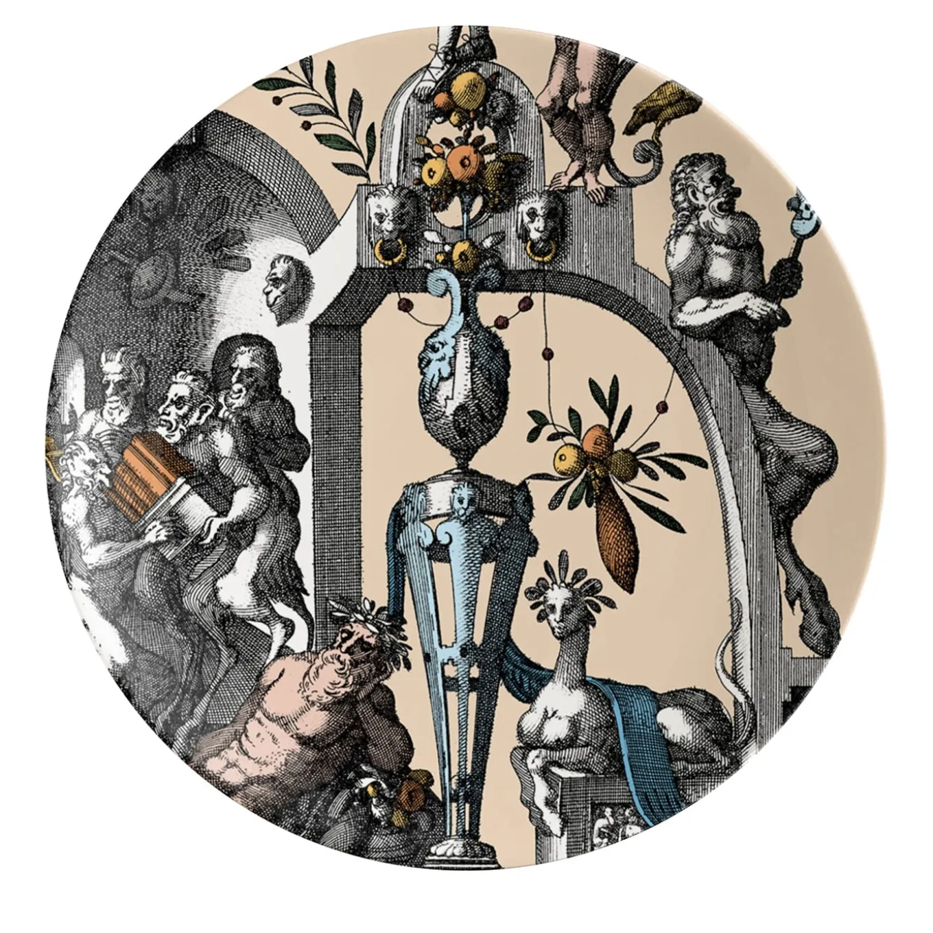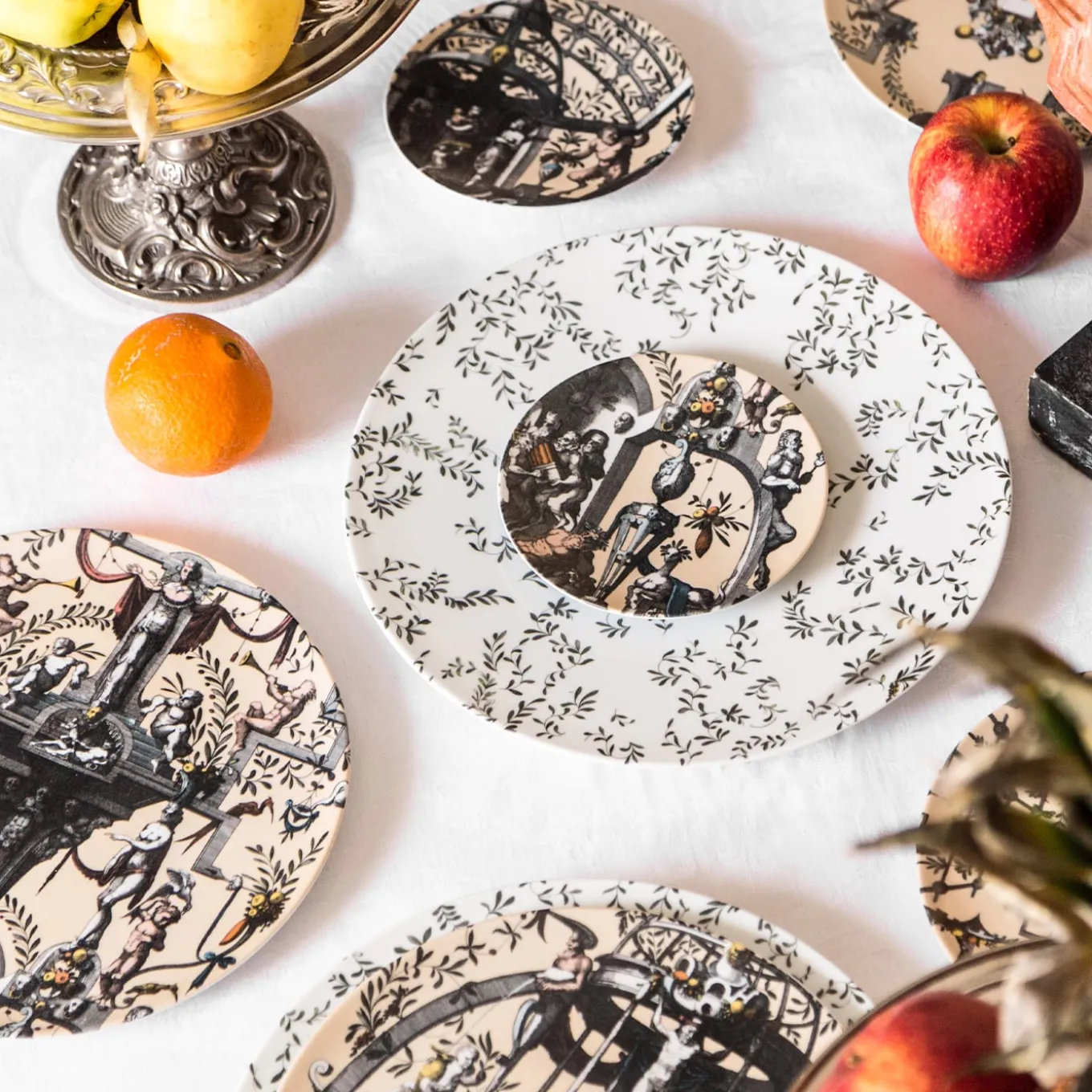 The new Pompei porcelain collection brings back the Grottesche wall decoration in a contemporary key. Ancient designs are taken and declined on the different formats of the mise en place in such a way as to create elegant and unique plays of overlapping. Natural elements, anthropomorphic figures, jewelry and architecture come together to create stories, decorations and geometries. This collection manages to be transversal, adapting to both regal and elegant tables and more formal settings.