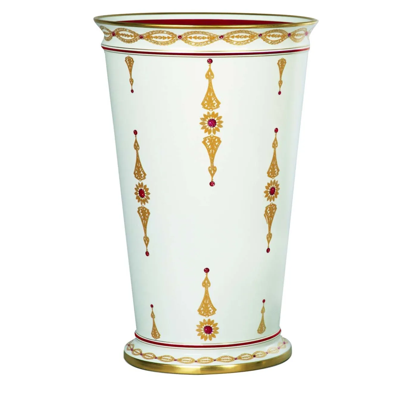 This exquisite vase is a tribute to the versatility of the finest porcelain, here boasting eye-catching golden decorations with vivid red details. Ideally displayed in classic decors as an apt homage to the timeless beauty of this precious material, this exclusive vase will be stunning also paired with other refined objects from the same collection.