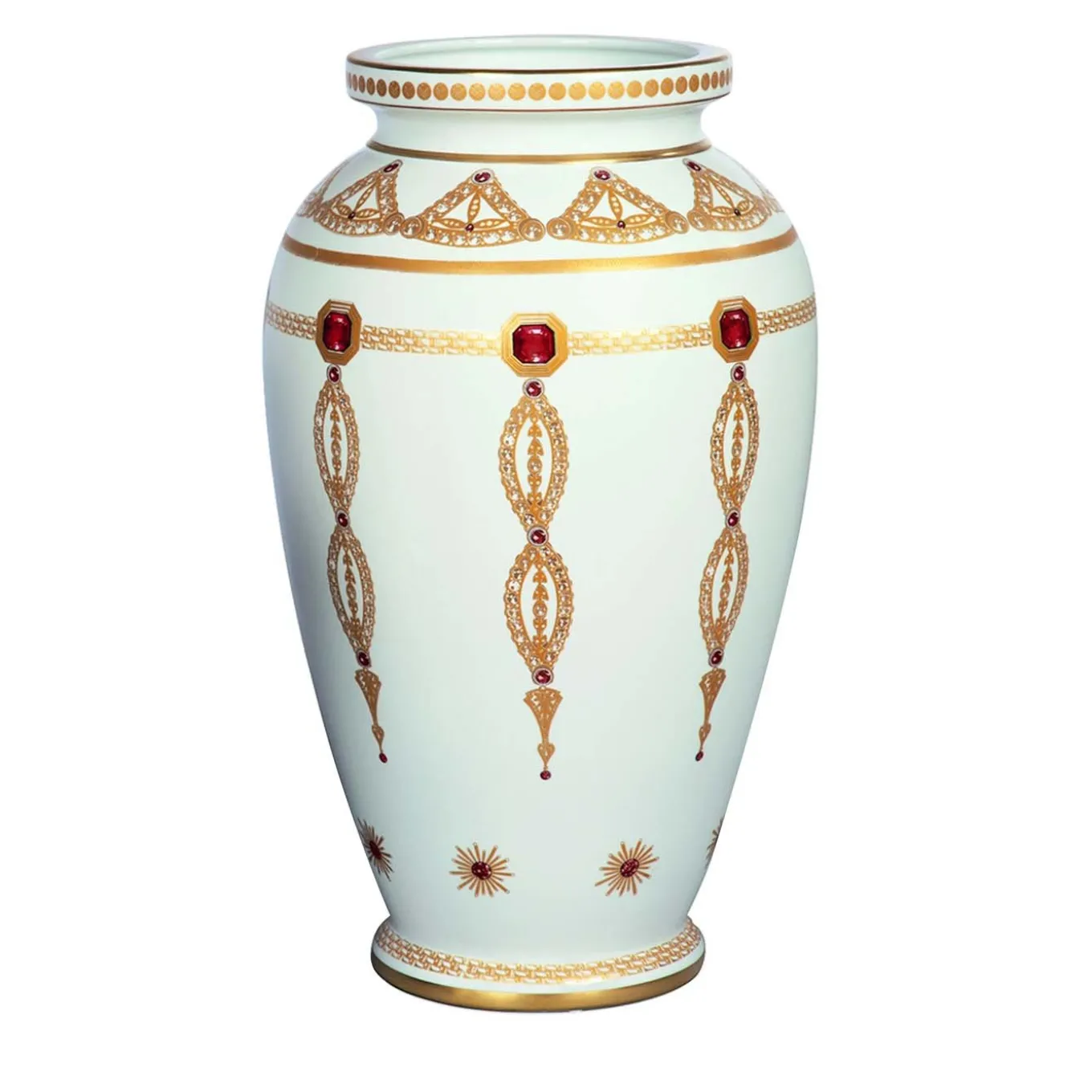 Ornate with precious jewel-like and sunburst decorations, this sophisticated umbrella stand in white porcelain is a fitting addition to complement lavish decors. Its classic profile effortlessly enhances the decorations’ allure, showcasing multiple nuances of gold and red.